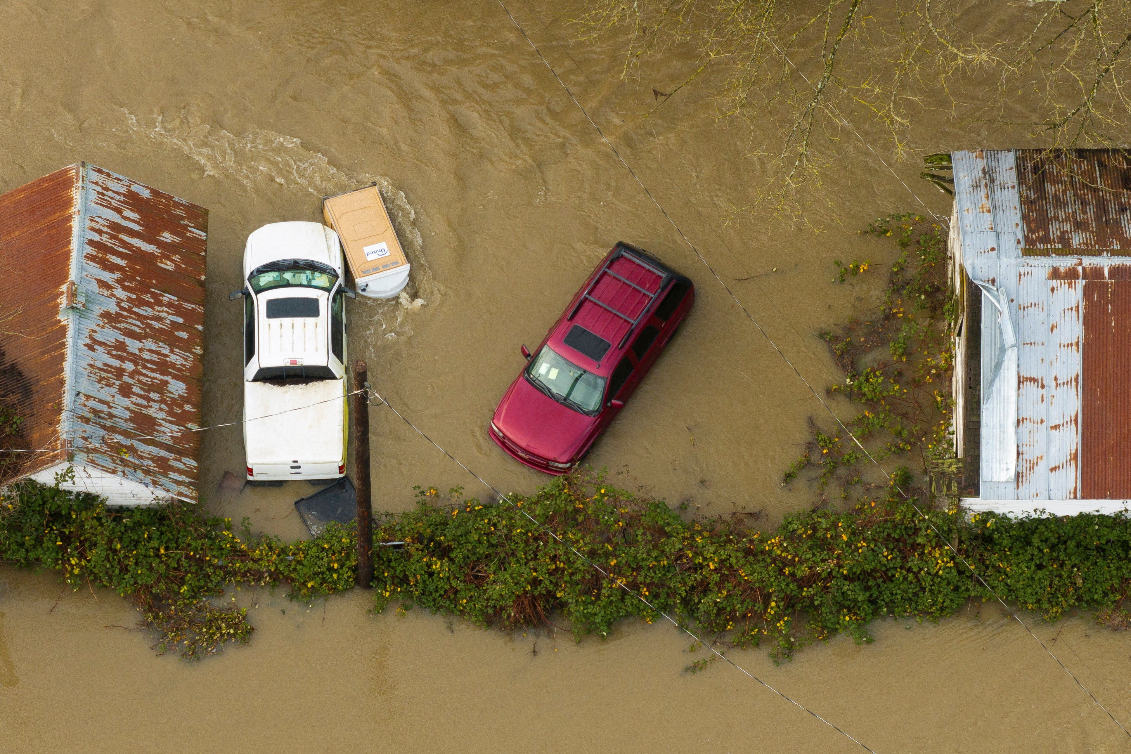 A drone view shows vehicles in an area flooded by the Snoqualmie River in Fall City, Washington, on December 9, 2025. (Photo by David Ryder/Reuters)