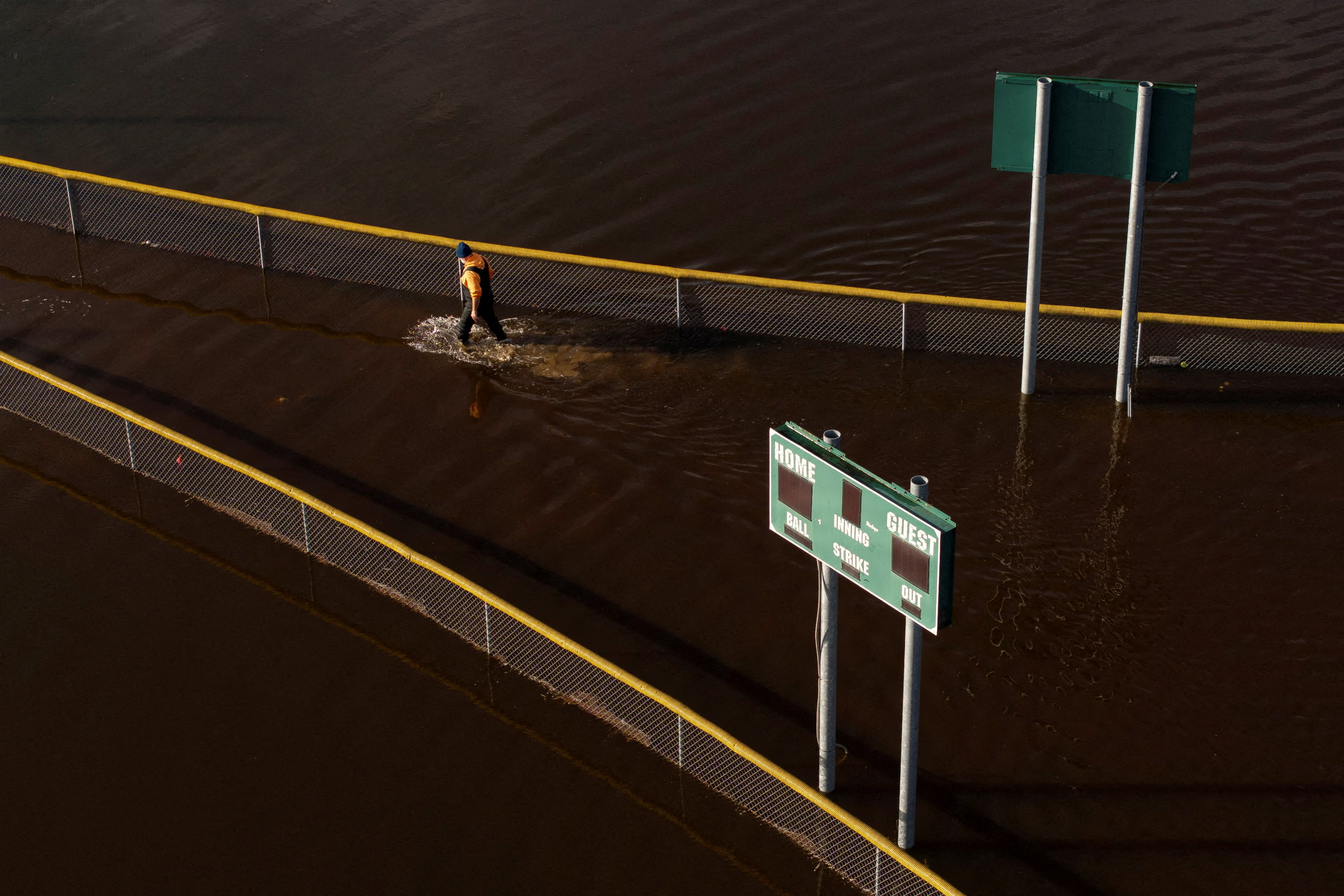 A drone view shows a person walking between baseball fields flooded by the Snoqualmie River, as an atmospheric river brings rain and flooding to the Pacific Northwest, in Fall City, Washington, on December 9, 2025. (Photo by David Ryder/Reuters)