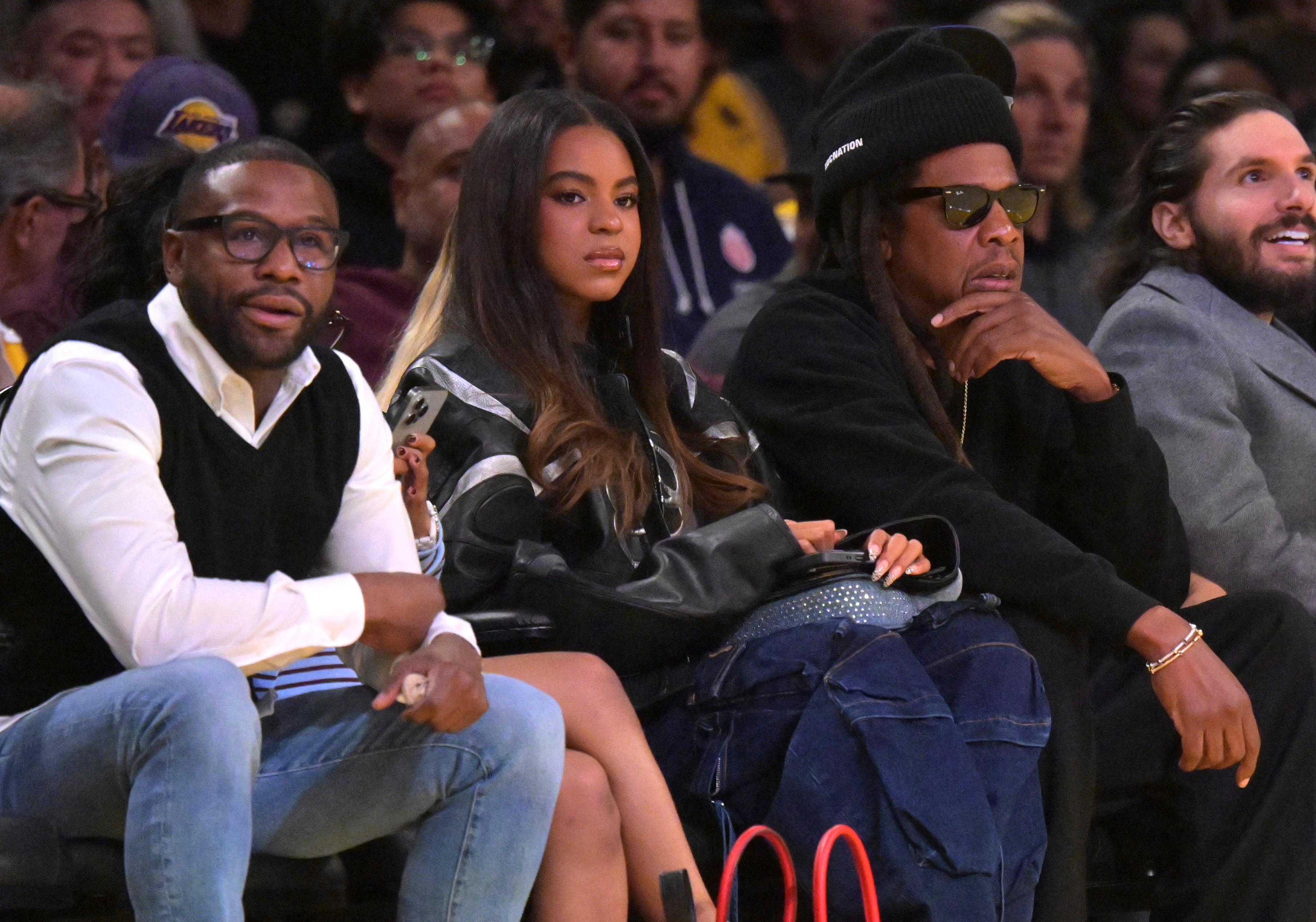 Floyd Mayweather Jr., former professional boxer, sits next to Blue Ivy Carter, and rapper Jay-Z as they attend the game between the Los Angeles Lakers and the San Antonio Spurs at Crypto.com Arena in Los Angeles, California on December 10, 2025. (Photo by Jayne Kamin-Oncea/Reuters)