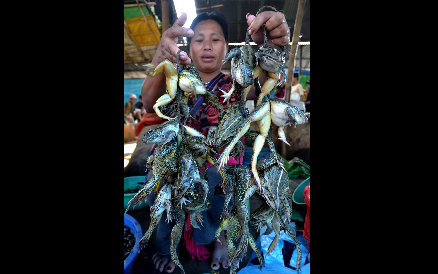 Indian saleswoman shows frogs for sale in market Dimapur, India. (Photo by AFP Photo)