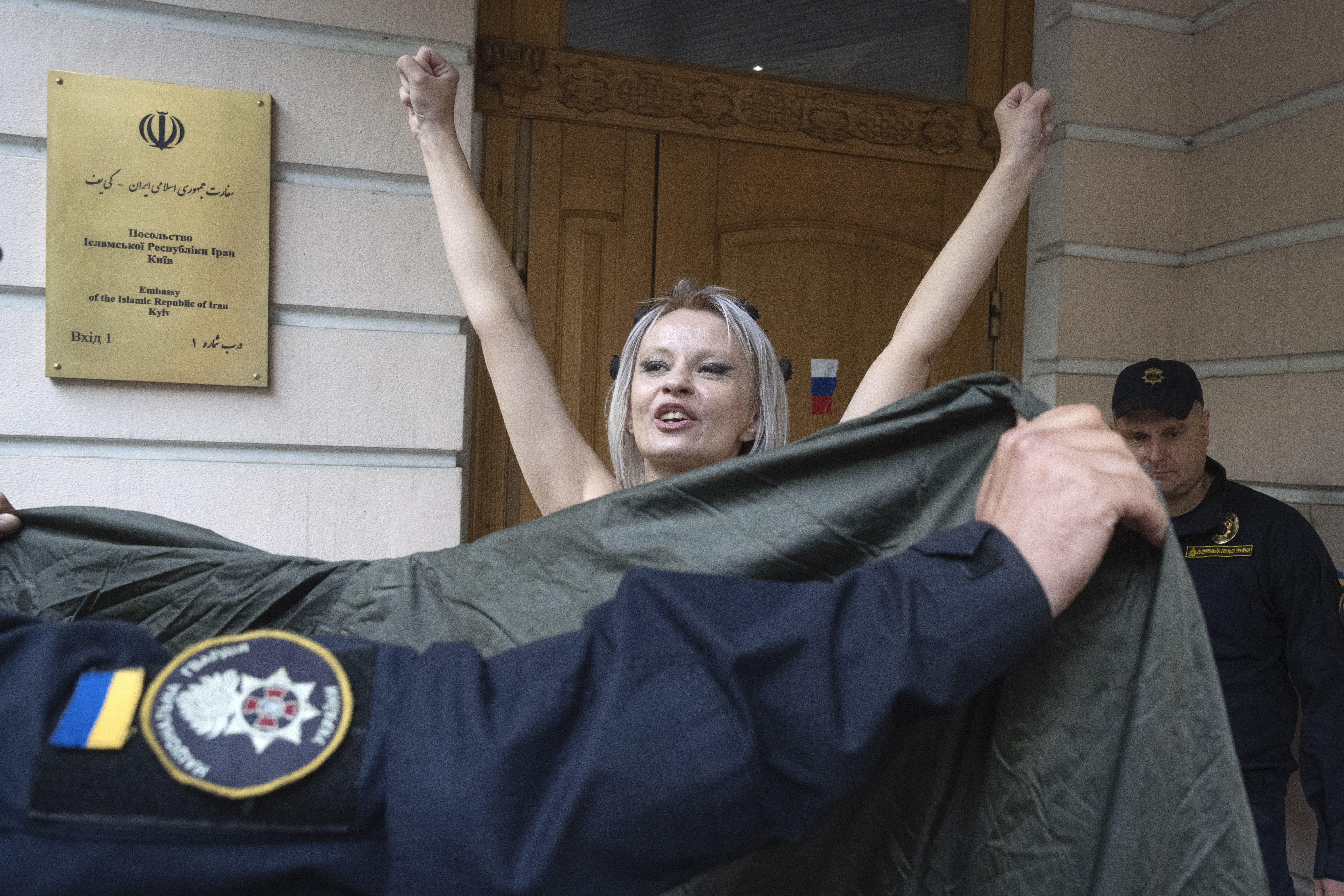 A police officer covers a topless activist of the Femen feminist group protesting against Russia-Iran military cooperation in front of the Iran Embassy in Kyiv, Ukraine, Friday, October 4, 2024. (Photo by Efrem Lukatsky/AP Photo)