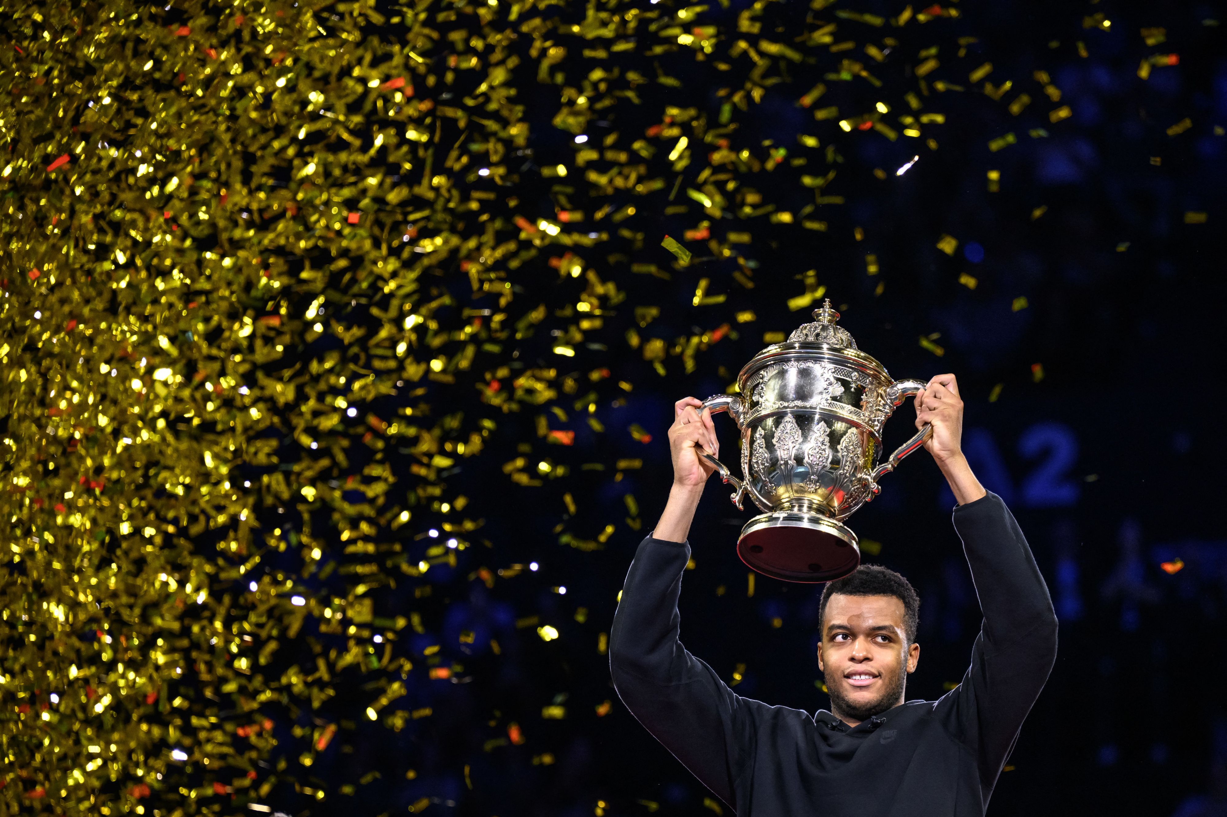 France's Giovanni Mpetshi Perricard raises the trophy after winning the final match of the Swiss Indoors ATP 500 tennis tournament against US' Ben Shelton in Basel on October 27, 2024. (Photo by Fabrice Coffrini/AFP Photo)