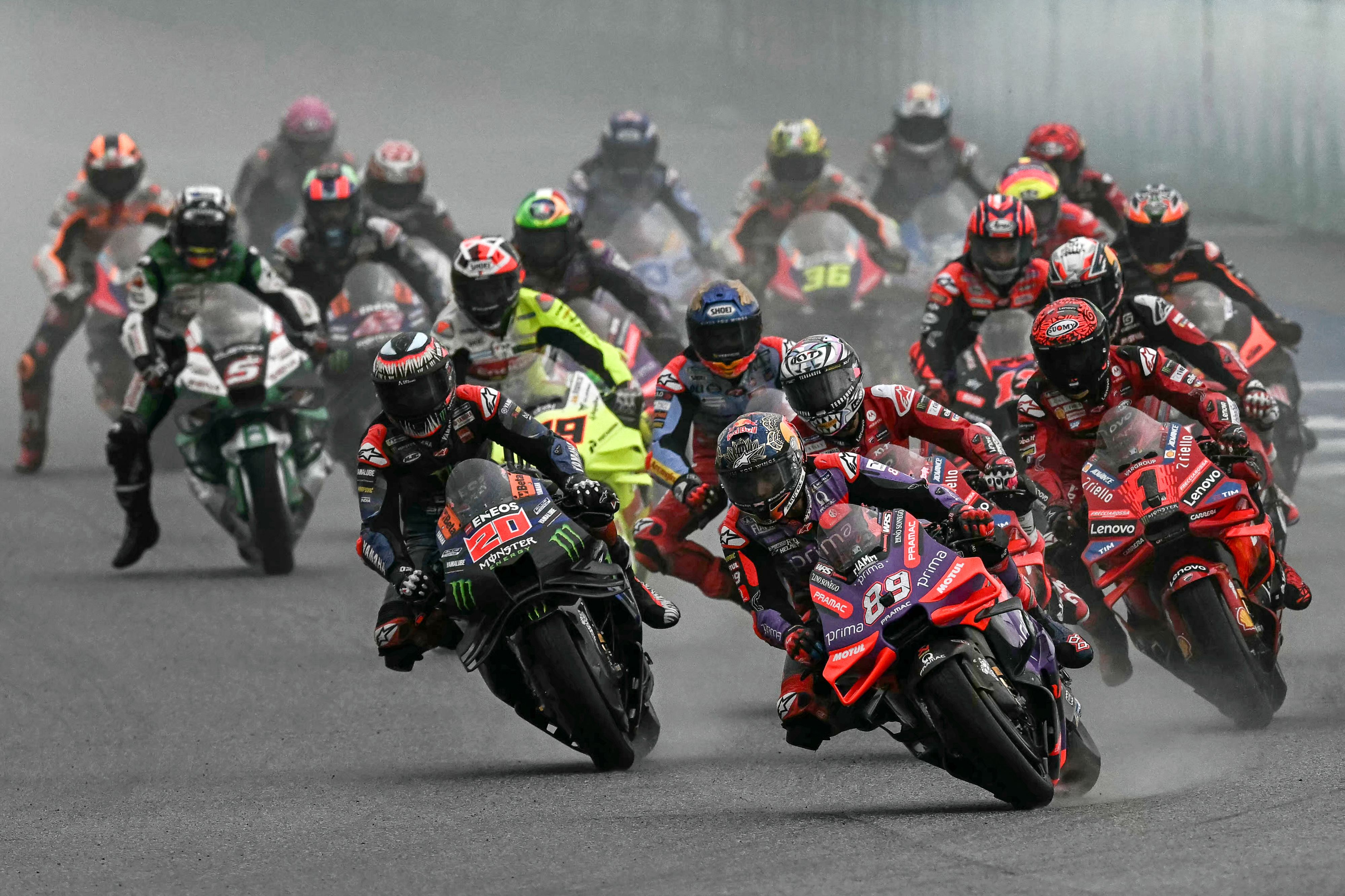 Prima Pramac Racing's Spanish rider Jorge Martin (centre R) leads the pack during the MotoGP Thailand Grand Prix at the Buriram International Circuit in Buriram on October 27, 2024. (Photo by Lillian Suwanrumpha/AFP Photo)