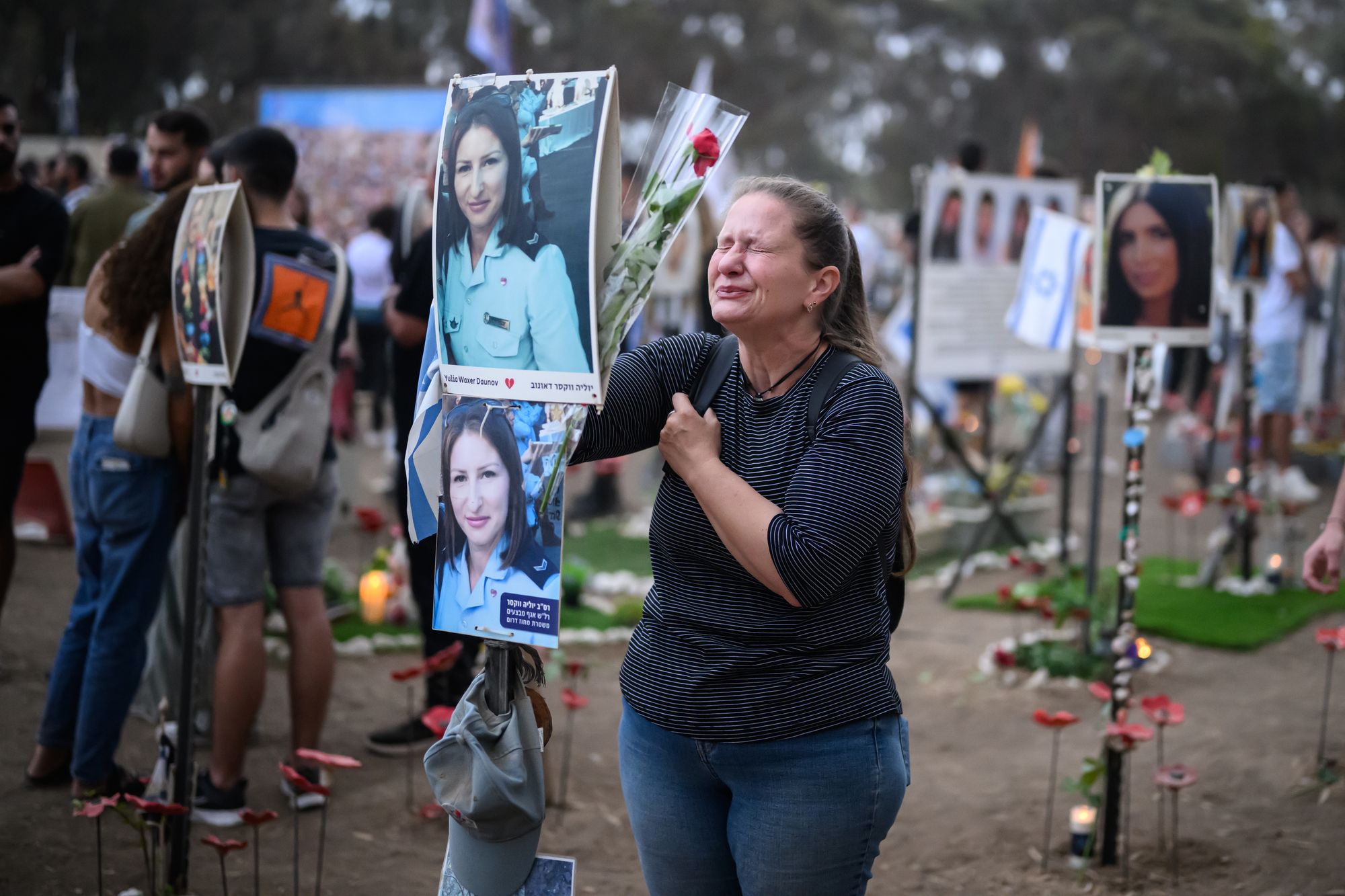 A woman breaks down at the memorial to Yulia Waxer Daunov as family members and friends of the lost and kidnapped gather at the site of the Nova Festival to mark the one year anniversary of the attacks by Hamas, on October 07, 2024 in Re'im, Israel. Various commemorations are taking place around Israel to mark the anniversary of the Hamas attacks in Israel. On October 7, 2023, members of Hamas mounted a series of attacks and raids on Israeli citizens in the Gaza Envelope border area of Israel. 251 Israelis and foreigners were kidnapped with nearly 100 still unaccounted for and 1139 people were killed. (Photo by Leon Neal/Getty Images)