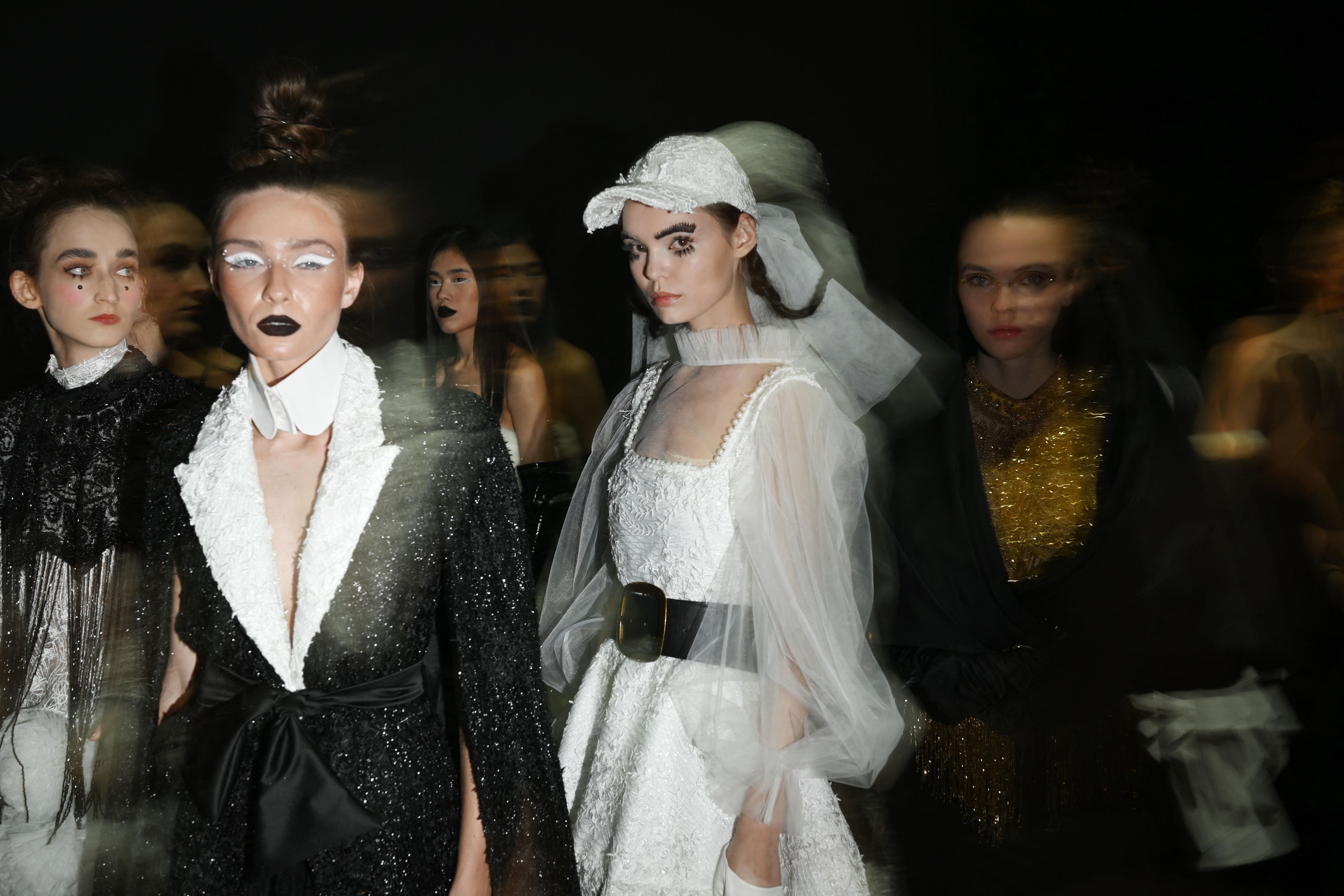 Models prepare backstage for the show of the Russian brand Barbino Maison during the Moscow Fashion Week at the Manezh exhibition hall in Moscow on October 9, 2024. (Photo by Natalia Kolesnikova/AFP Photo)