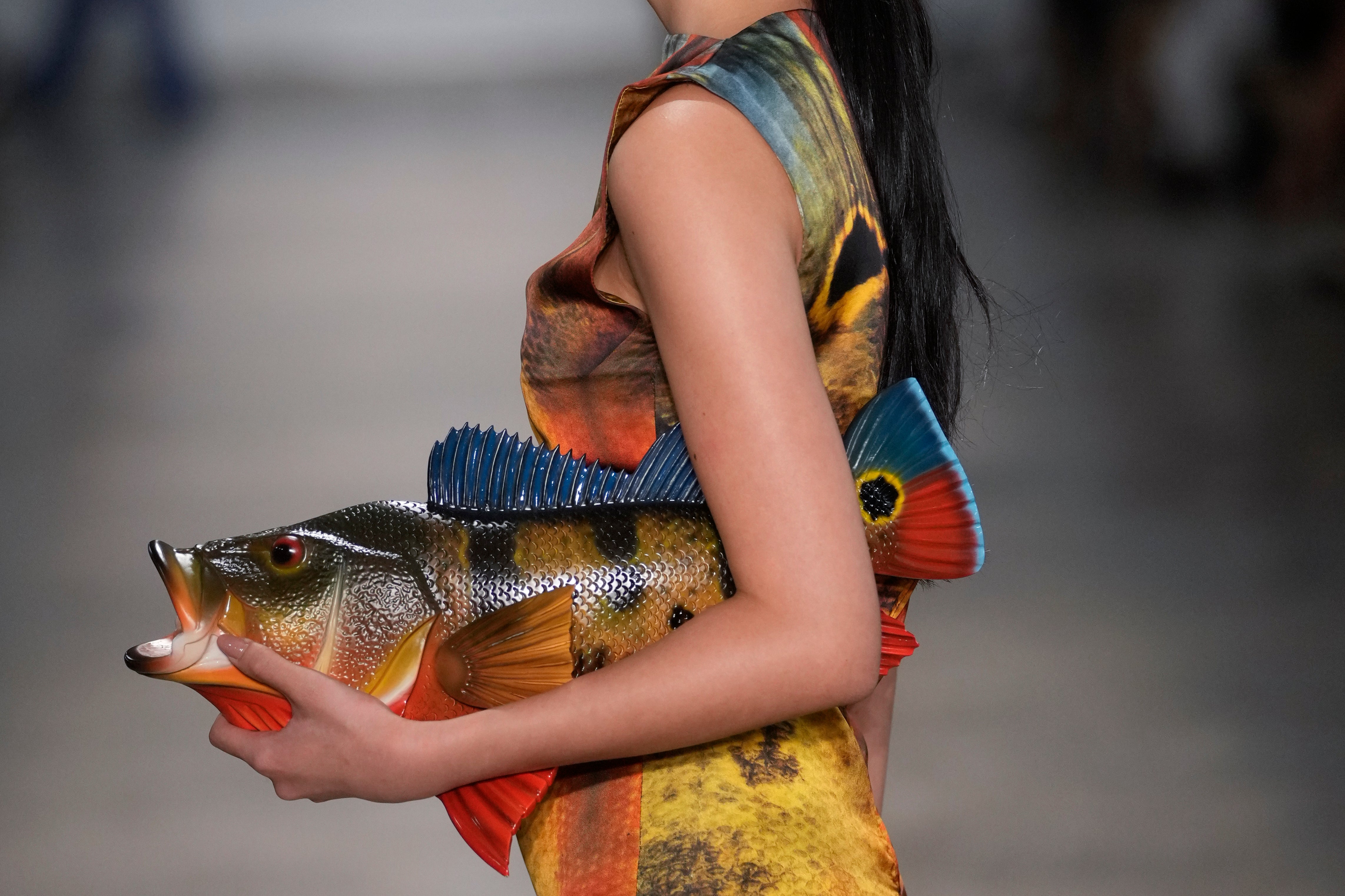 A model wears a creation from the Normando collection during Sao Paulo Fashion Week in Sao Paulo, Wednesday, October 16, 2024. (Photo by Andre Penner/AP Photo)