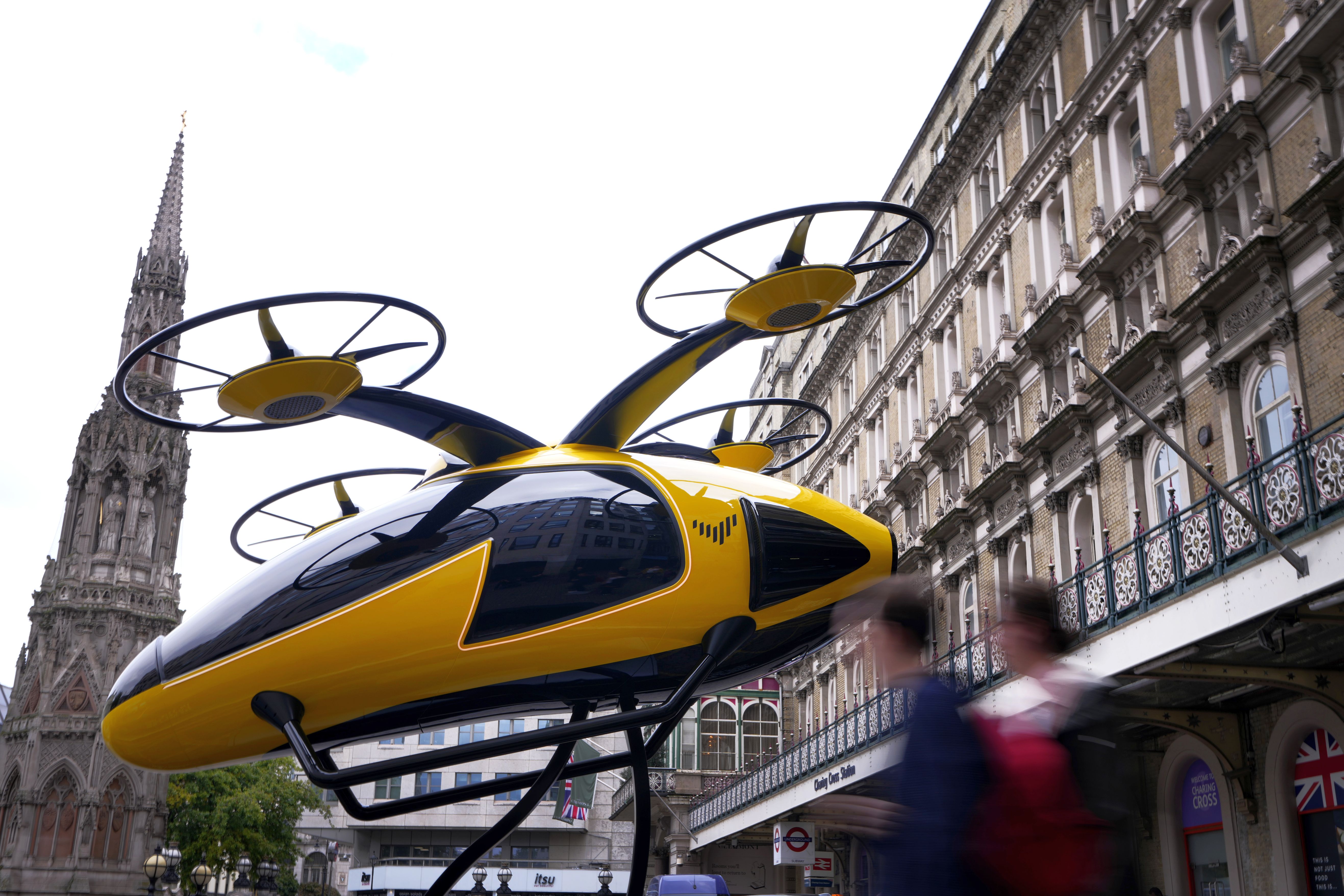 Pedestrians pass a prototype of a flying taxi, which is currently in development in the United Arab Emirates (UAE), after it was unveiled in the taxi rank outside Charing Cross railway station in London, Wednesday, October 9, 2024. (Photo by Kirsty Wigglesworth/AP Photo)
