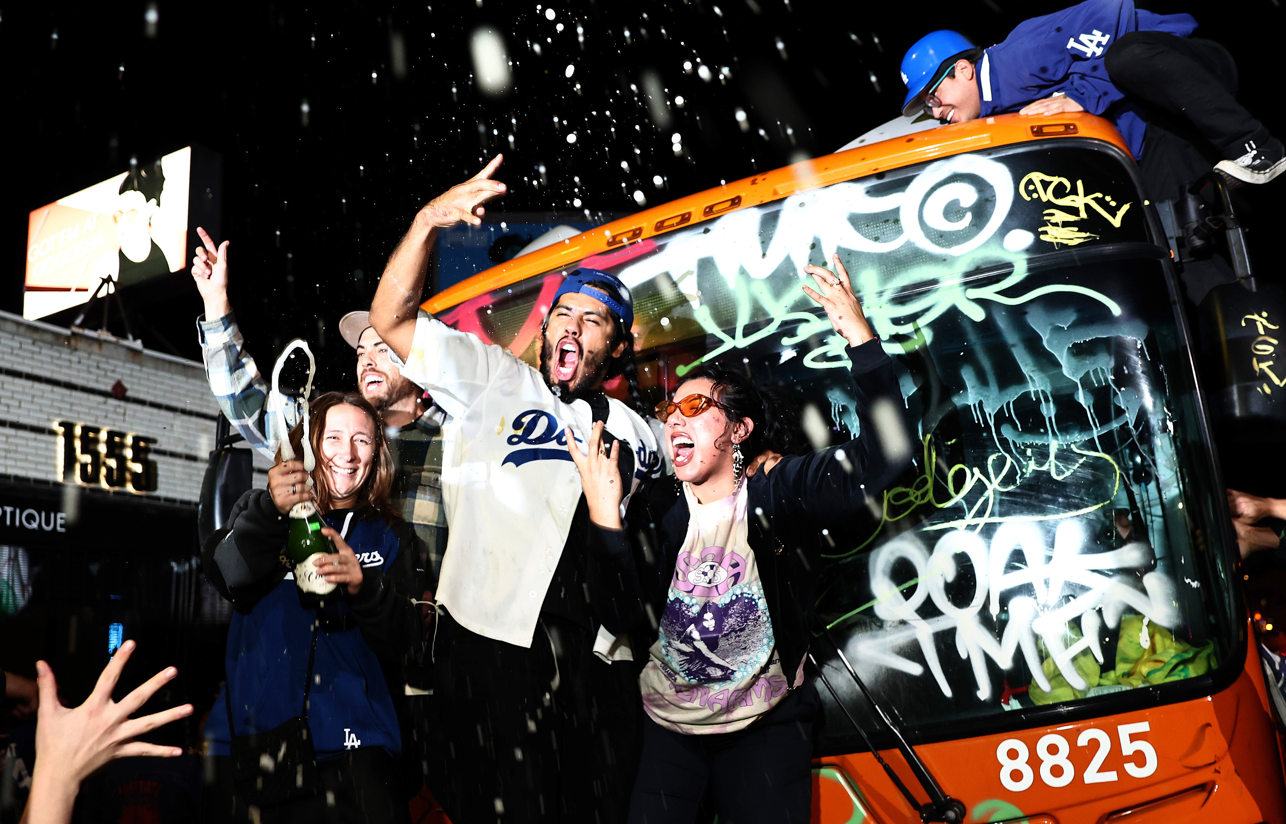 Dodgers fans celebrate in Echo Park in front of a bus that was tagged after the Los Angeles Dodgers defeated the New York Yankees in Game 5 to win the World Series on October 30, 2024 in Los Angeles, California. The Dodgers plan to hold a victory parade on Friday. (Photo by Mario Tama/Getty Images)