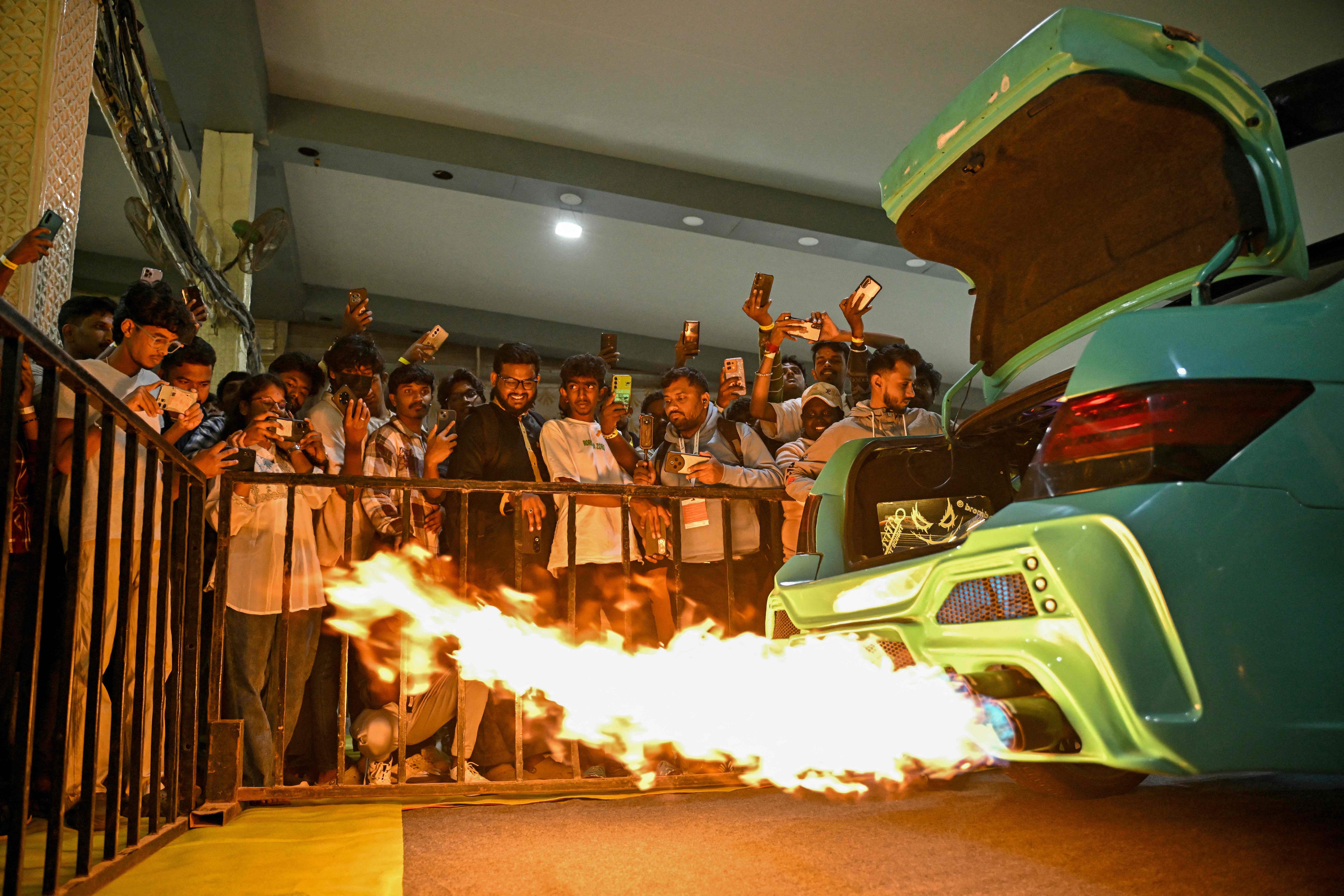 Visitors check the exhaust of a modified Honda City during the 4th International Autoshow 2025 at the Palace Grounds in Bengaluru on November 14, 2025. (Photo by Idrees Mohammed/AFP Photo)