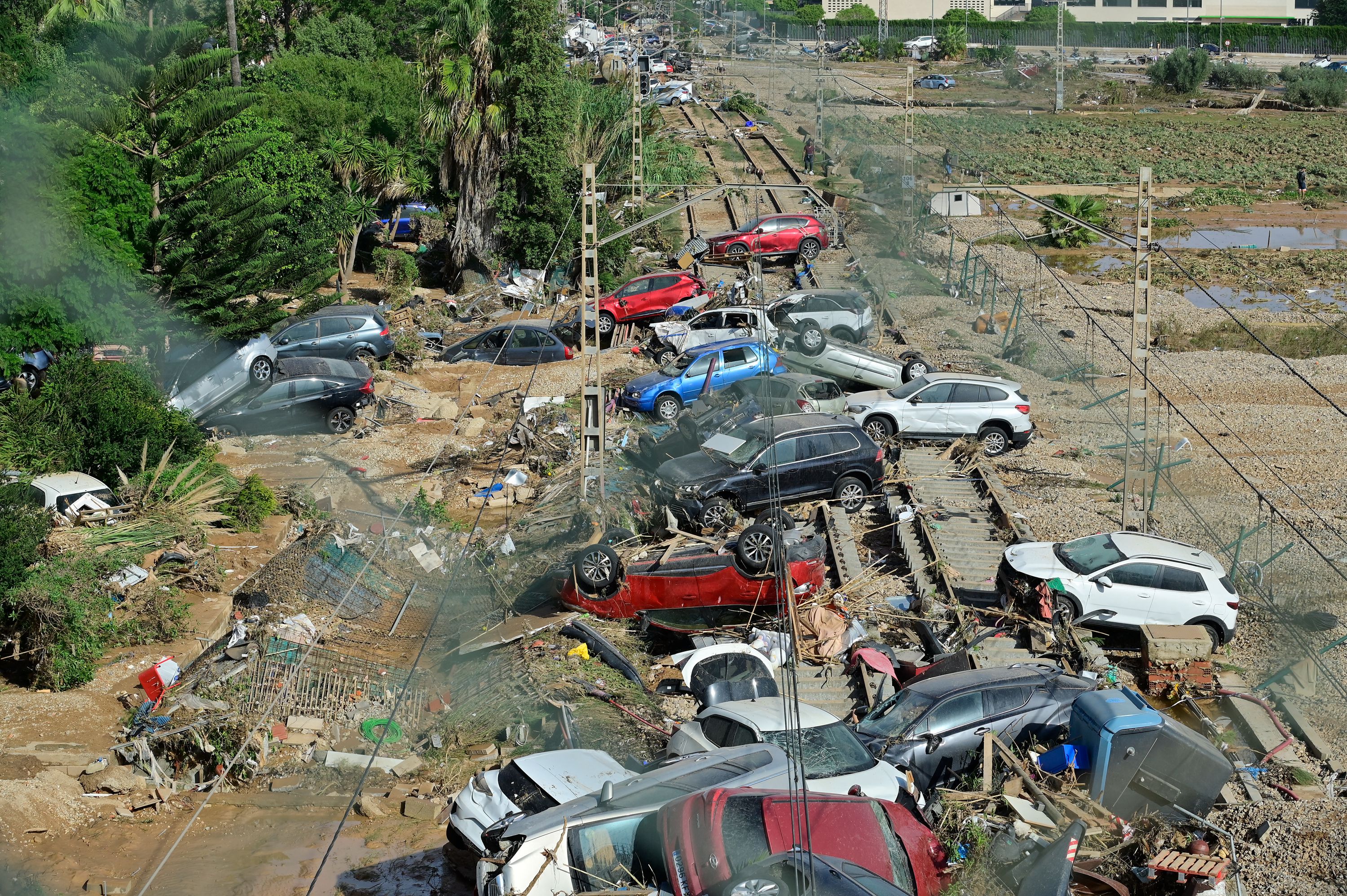 Wreckage of cars pile up on the on the railway on October 31, 2024 after flash floods ravaged the town of Alfafar, in the region of Valencia, eastern Spain. Rescuers raced on October 31, 2024 to find survivors and victims of once-in-a-generation floods in Spain that killed at least 95 people and left towns submerged in a muddy deluge with overturned cars scattered in the streets. About 1,000 troops joined police and firefighters in the grim search for bodies in the Valencia region as Spain started three days of mourning. Up to a year's rain fell in a few hours on the eastern city of Valencia and surrounding region on October 29 sending torrents of water and mud through towns and cities. (Photo by Jose Jordan/AFP Photo)