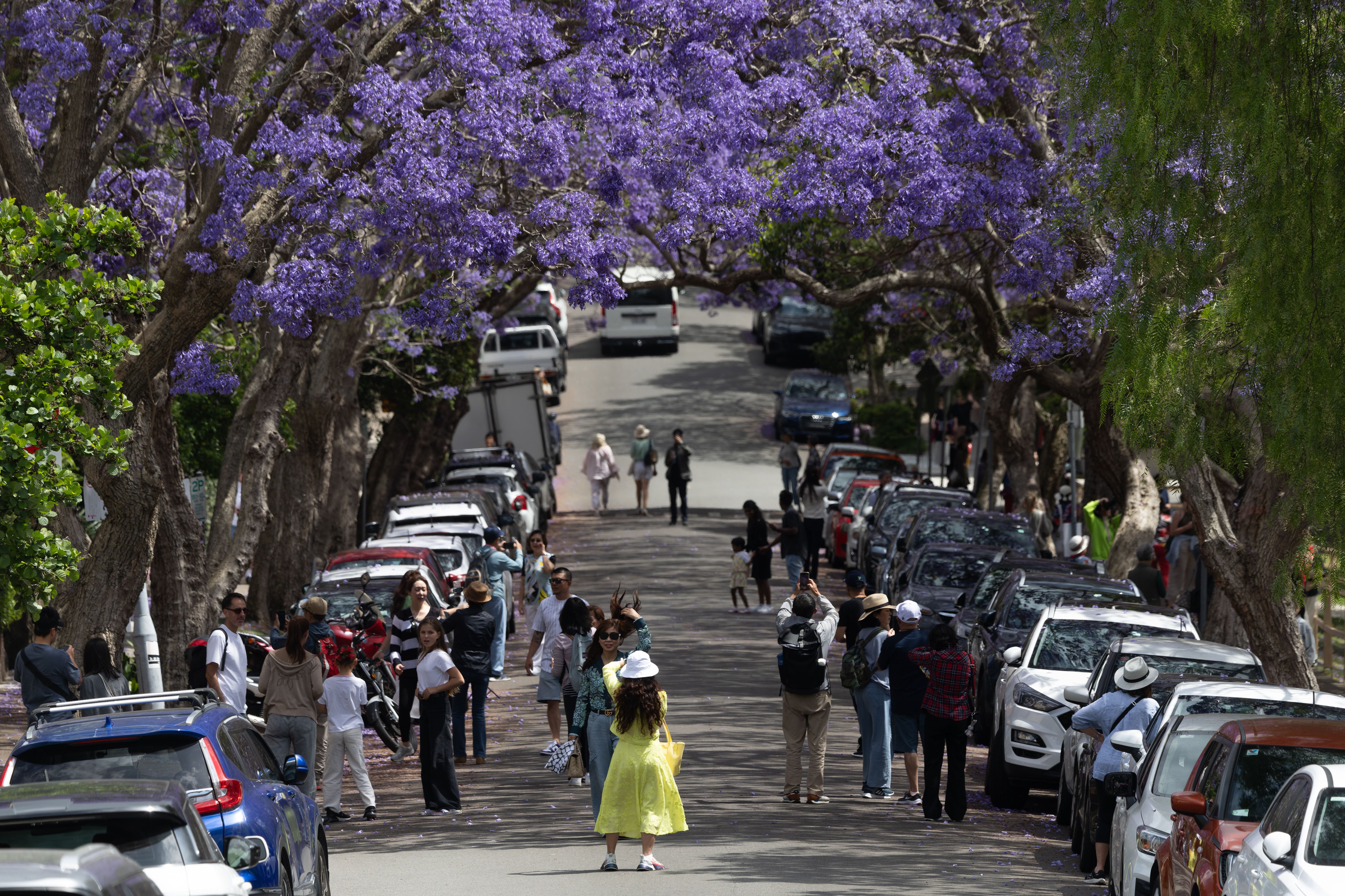 People take photos amongst blooming Jacaranda Trees on McDougall Street in Kirribilli on October 29, 2024 in Sydney, Australia. Jacarandas, which are not native to Australia, bloom in the spring. In Sydney, many parts of the city draw tourists and crowds as the trees welcome spring in November. (Photo by Brook Mitchell/Getty Images)