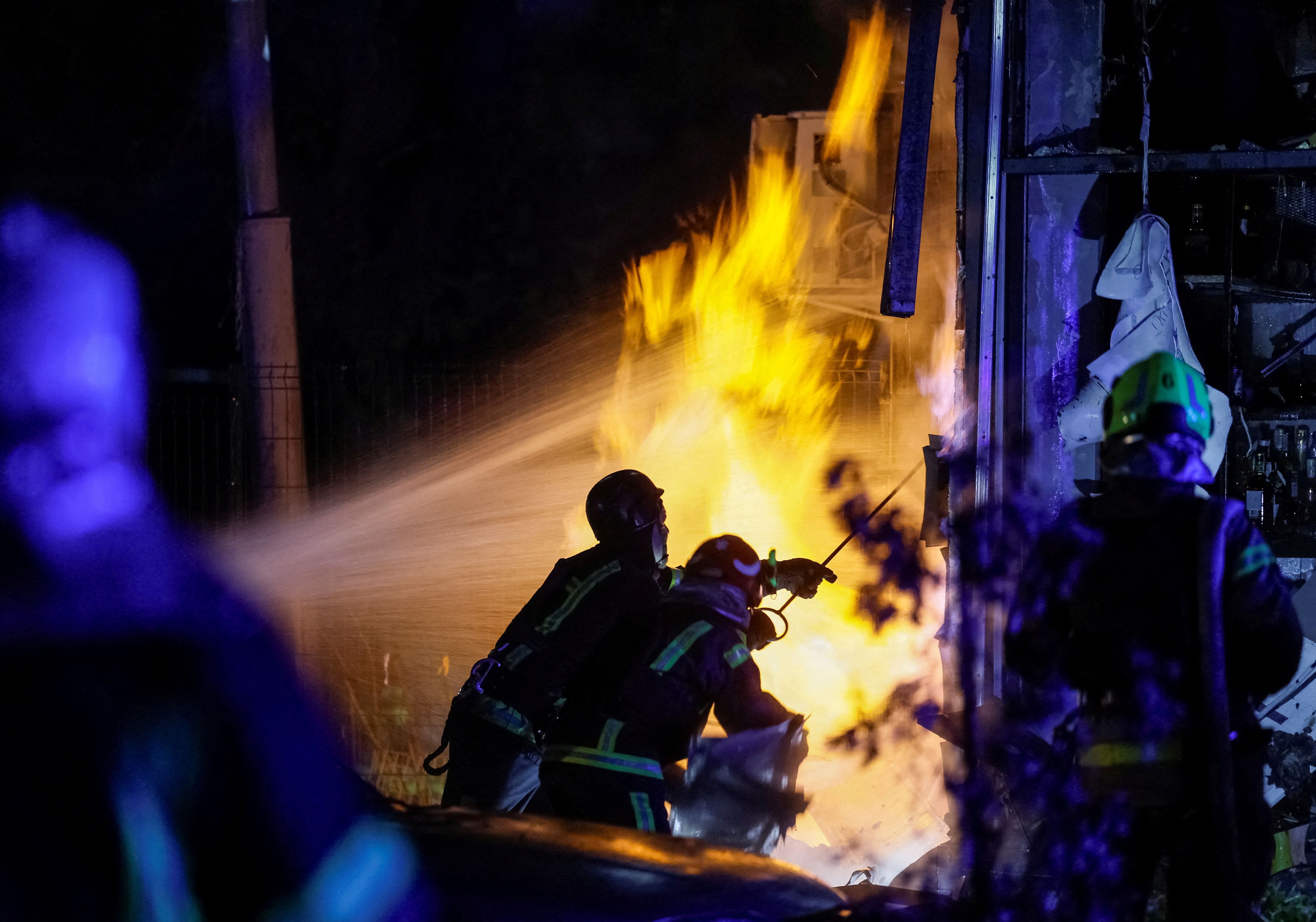 Firefighters work at a site of an apartment building hit by a Russian drone strike in Kyiv, Ukraine on October 29, 2024. (Photo by Gleb Garanich/Reuters)