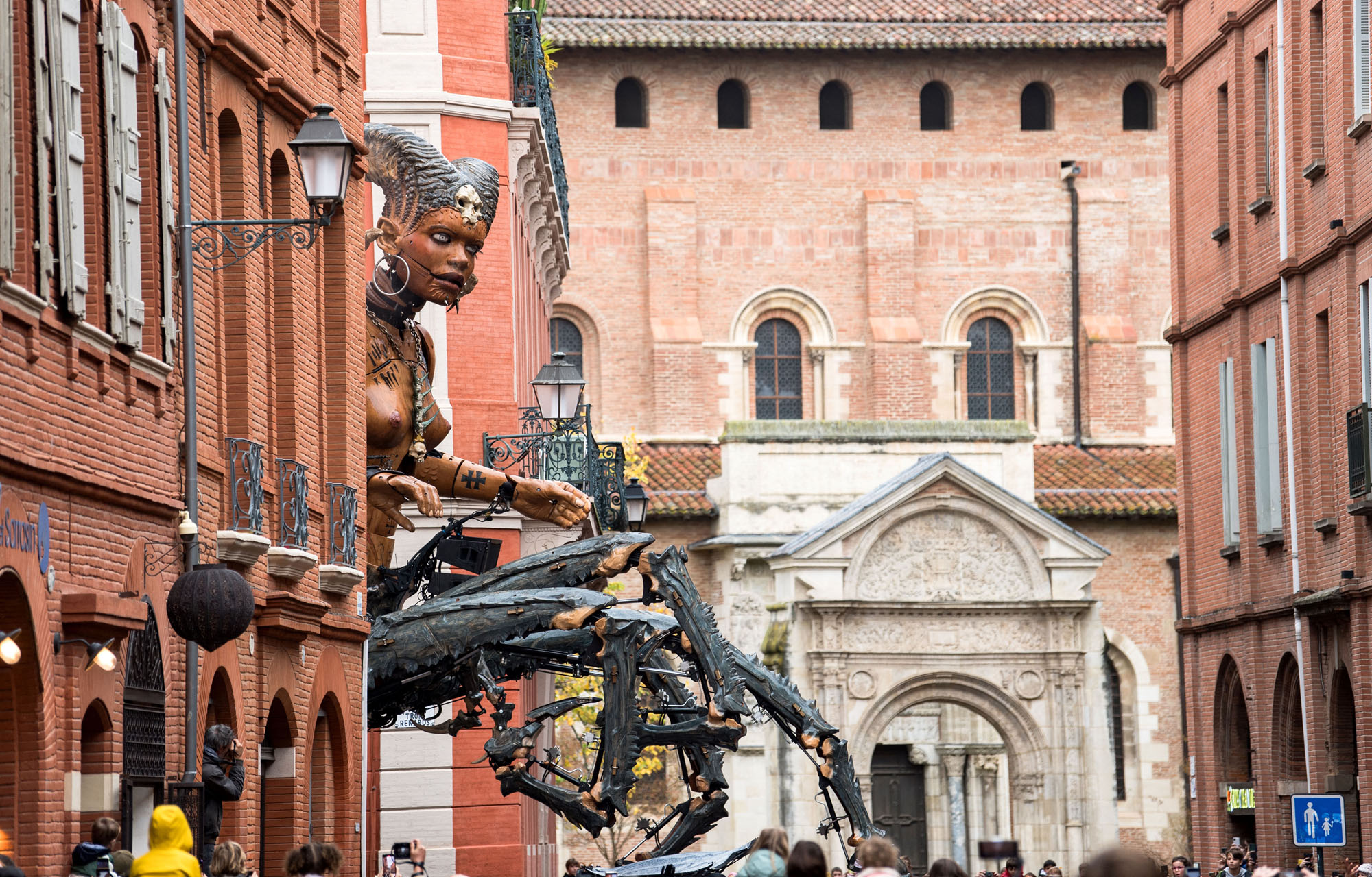The human head scorpion and spider creature Lilith, the guardian of darkness, parades during the major street show by French company La Machine, in Toulouse, southwestern France, on 26 October 2024. “Lilith” is one of the characters in the urban opera of the French company La Machine entitled “The Guardian of the Temple opus II: The Portal of Darkness”. (Photo by Matthieu Rondel/AFP Photo)