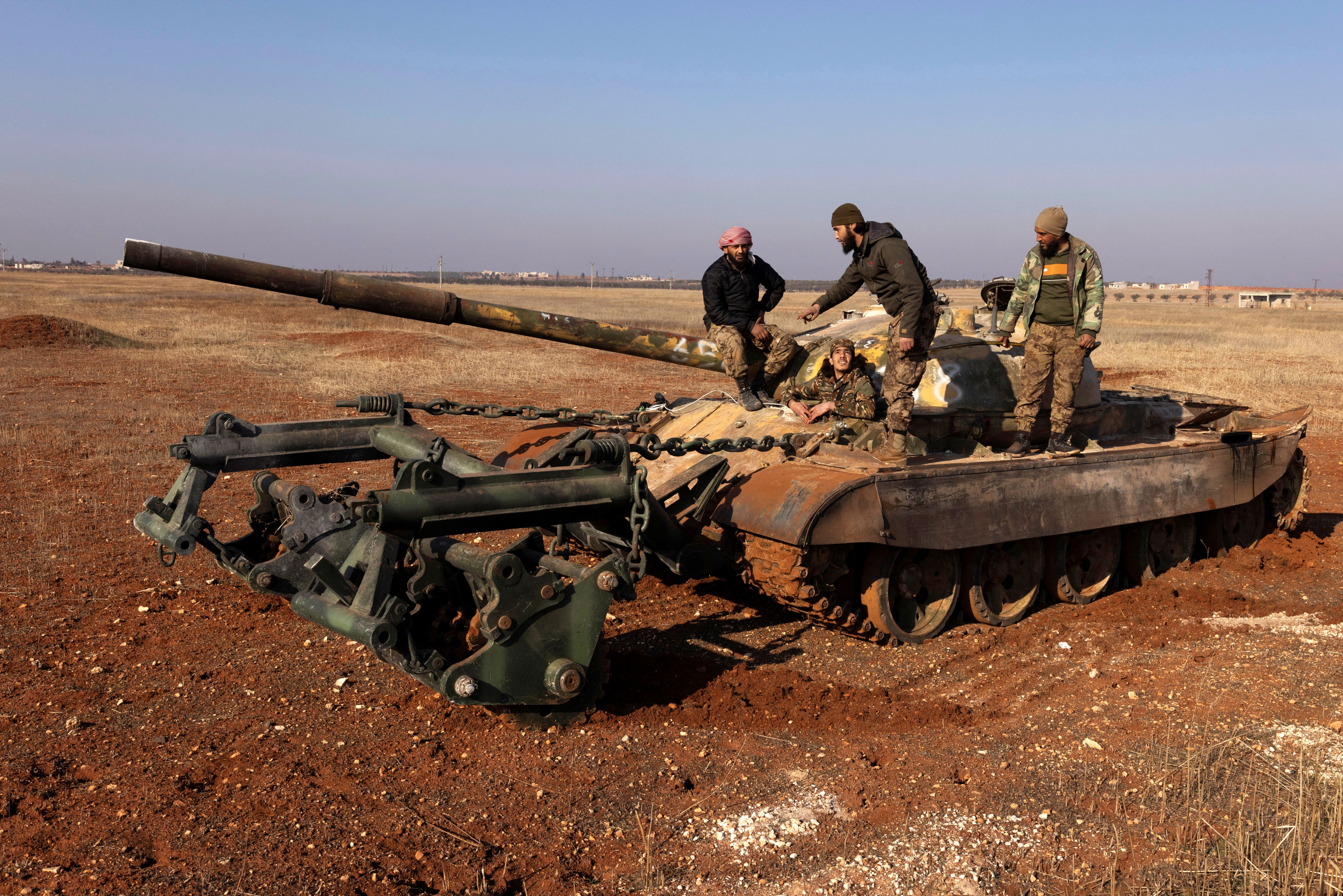 Fighters of the ruling Syrian body search for land mines using a T-62 tank with a mine clearing attachment, seized from Syria’s Bashar al-Assad army, on a road side in rural Aleppo, Syria on December 17, 2024. (Photo by Umit Bektas/Reuters)