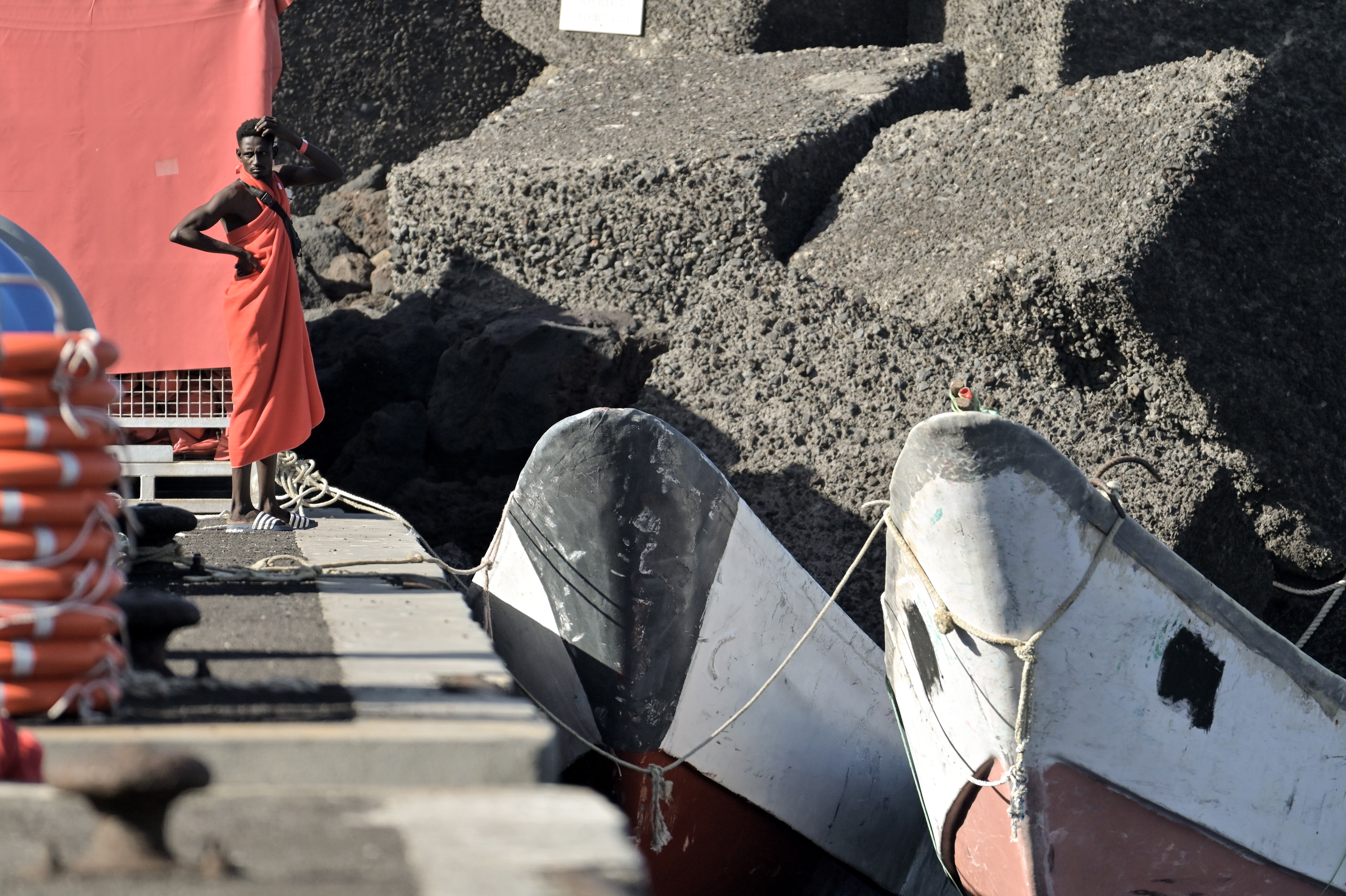 A migrant stands in front of canoes moored in the port of La Restinga, El Pinar municipality, El Hierro island, Canary Islands, Spain, 27 December 2024. More than 200 people travelling aboard several canoes were rescued early on 27 December by Spain's Maritime Rescue vessels off El Hierro island. (Photo by Gelmert Finol/EPA)