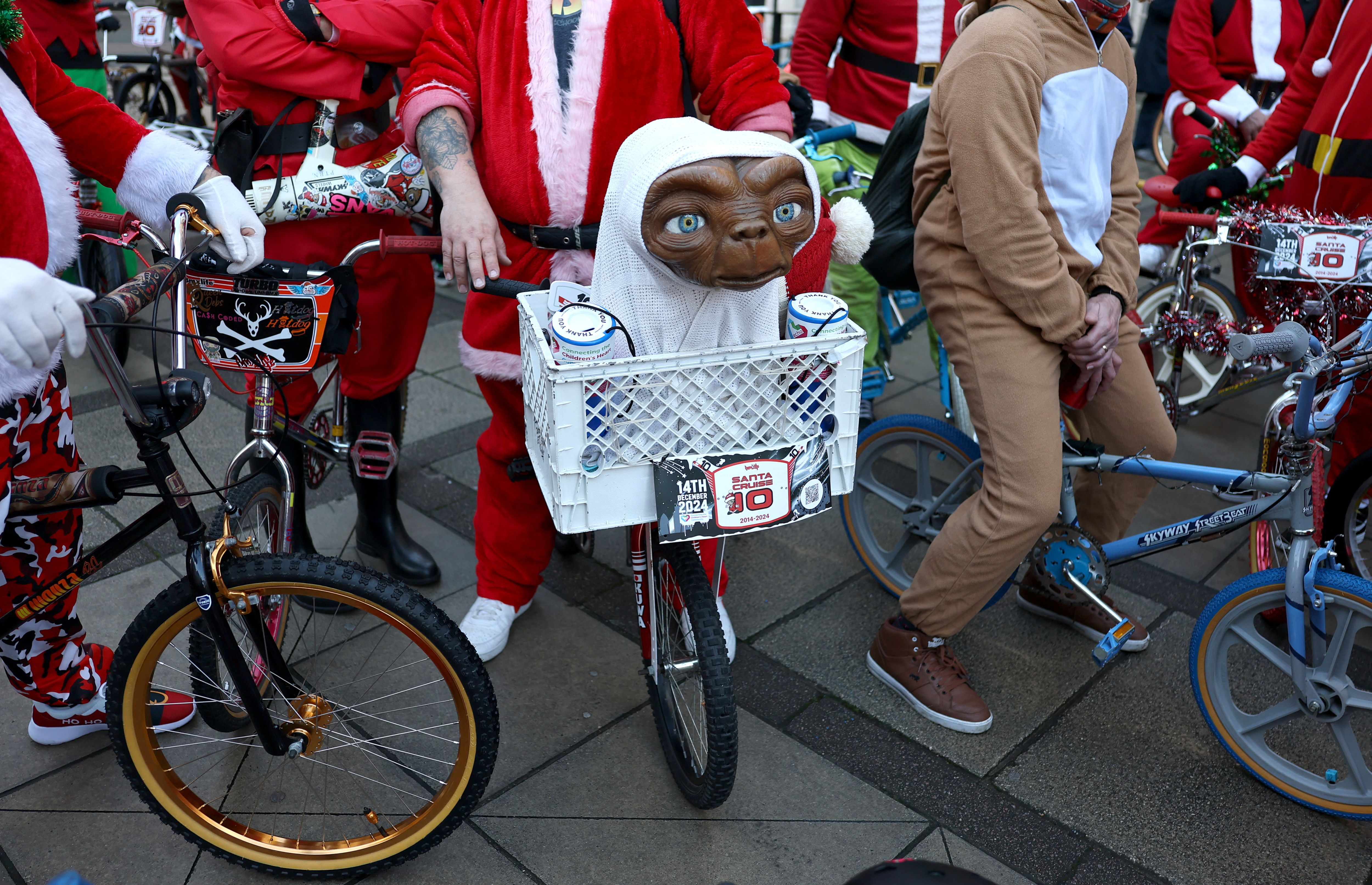 A model of the film character E.T. is seen as hundreds of BMX cyclists dressed in festive themed outfits take part in an annual charity ride called “Santa Cruise” to raise funds for Evelina Children's Hospital Heart Organisation, in London, Britain, on December 14, 2024. (Photo by Toby Melville/Reuters)