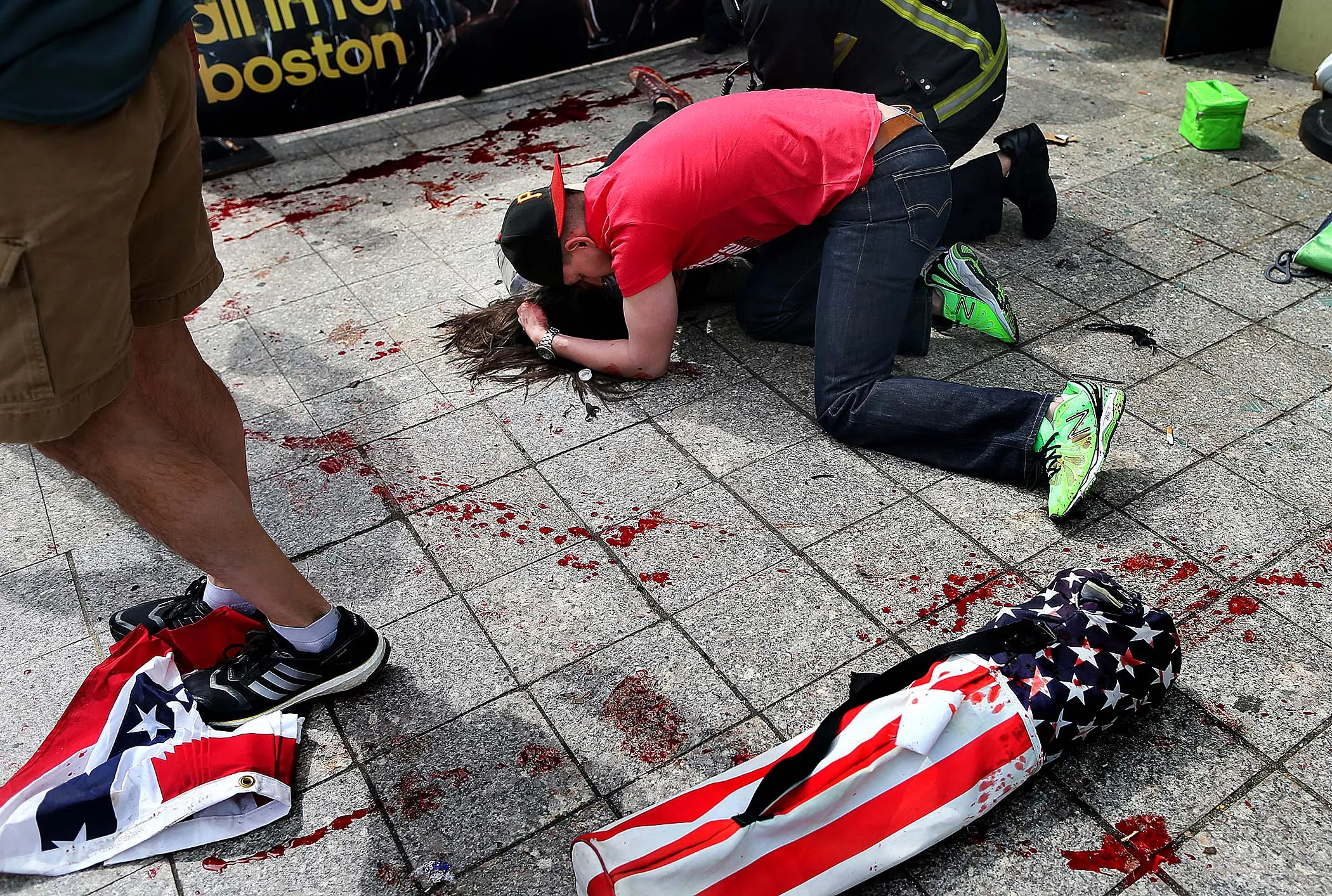 A man tries to comfort a victim near the scene of the first explosion. (Photo by John Tlumacki/The Boston Globe)