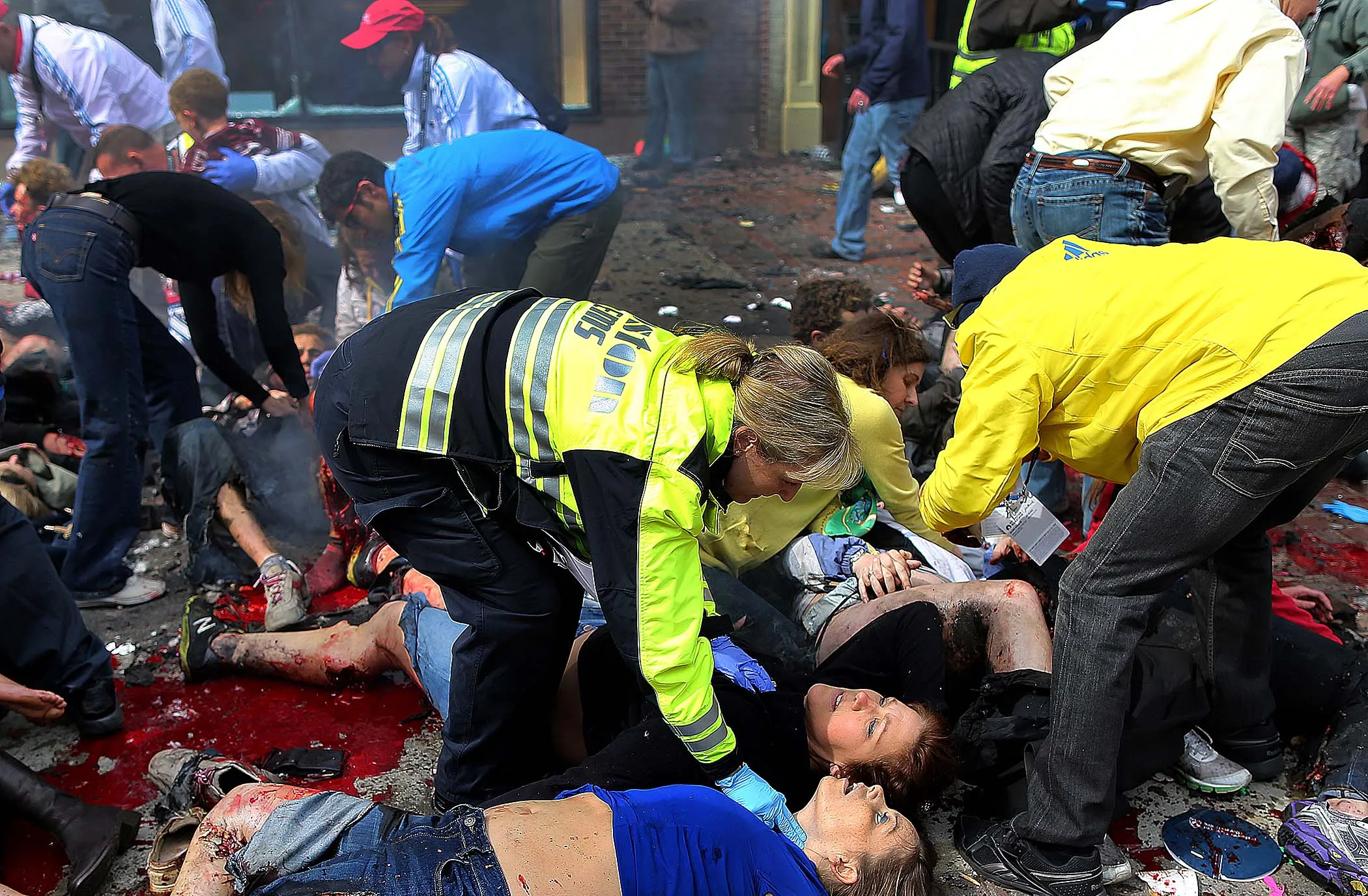 The scene moments after the first explosion near the finish line. (Photo by John Tlumacki/The Boston Globe)