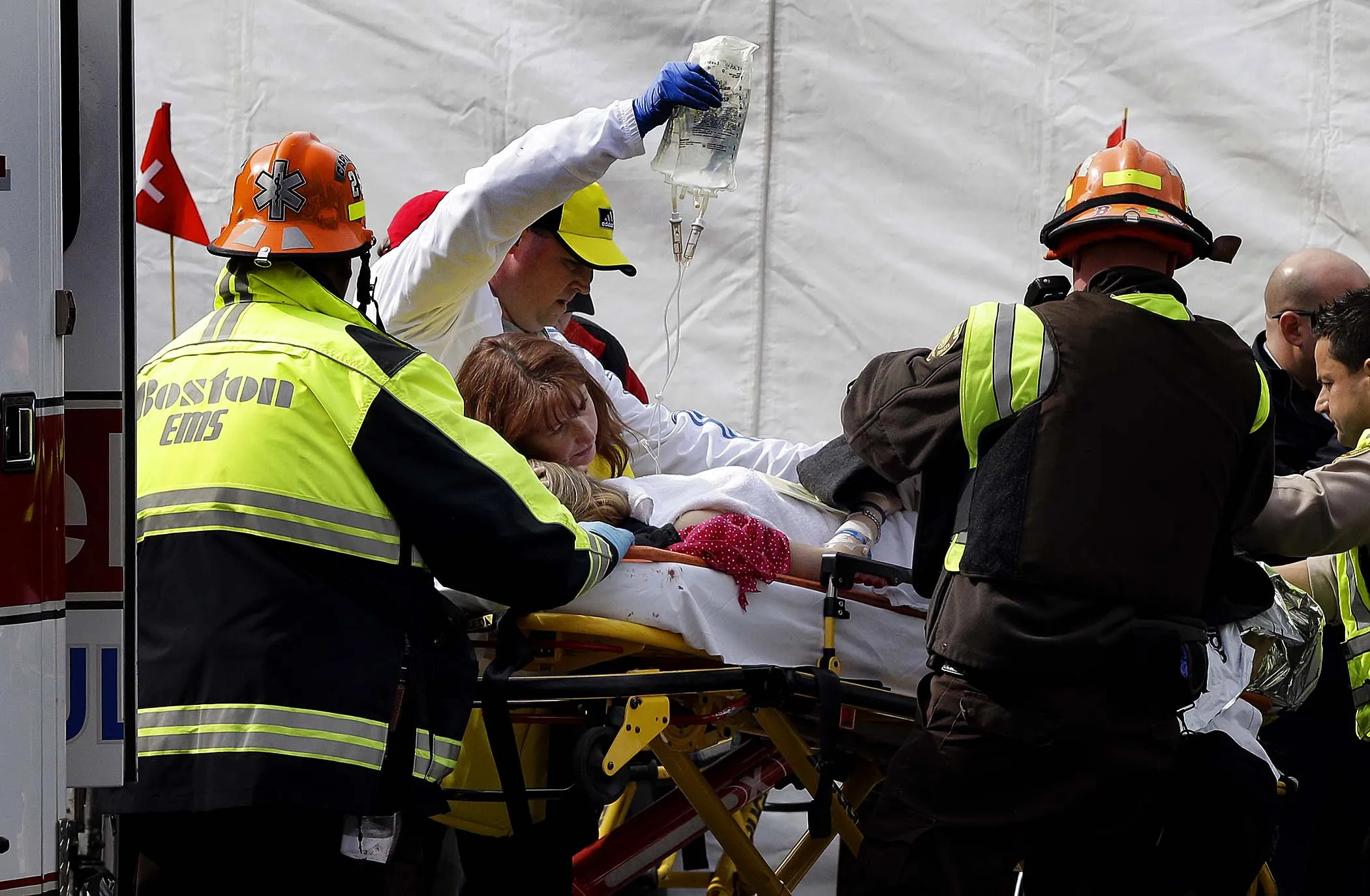 An injured woman is loaded into an ambulance in the aftermath of the two blasts. (Photo by Elise Amendola/Associated Press)