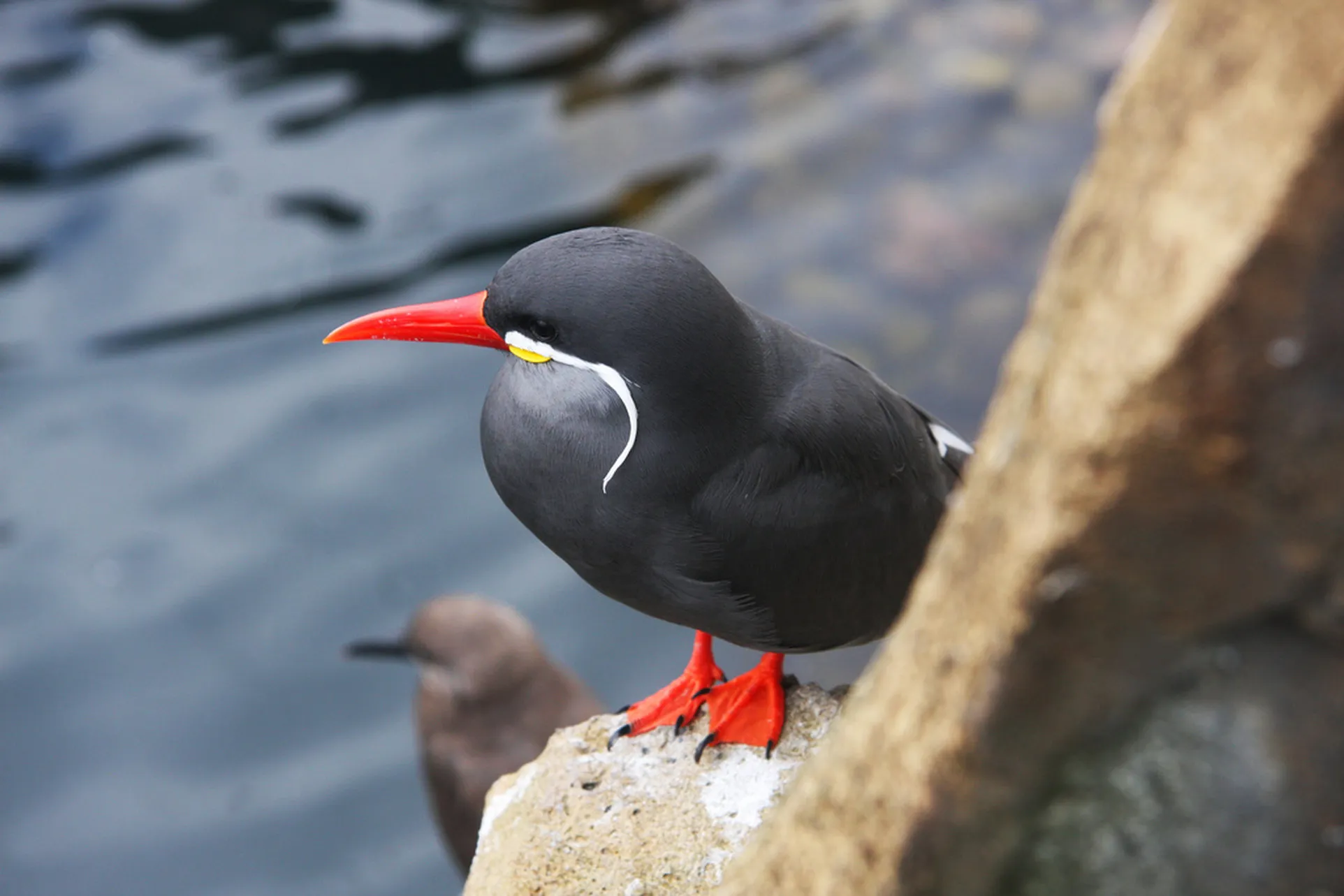 The Inca Tern is a seabird in the family Sternidae. It is the only member of the genus Larosterna. This uniquely plumaged bird breeds on the coasts of Peru and Chile, and is restricted to the Humboldt current. It can be identified by its dark grey body, white moustache on the both sides of its head, and red-orange beak and feet.
