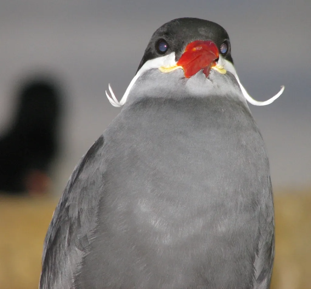 The Inca Tern is a seabird in the family Sternidae. It is the only member of the genus Larosterna. This uniquely plumaged bird breeds on the coasts of Peru and Chile, and is restricted to the Humboldt current. It can be identified by its dark grey body, white moustache on the both sides of its head, and red-orange beak and feet.