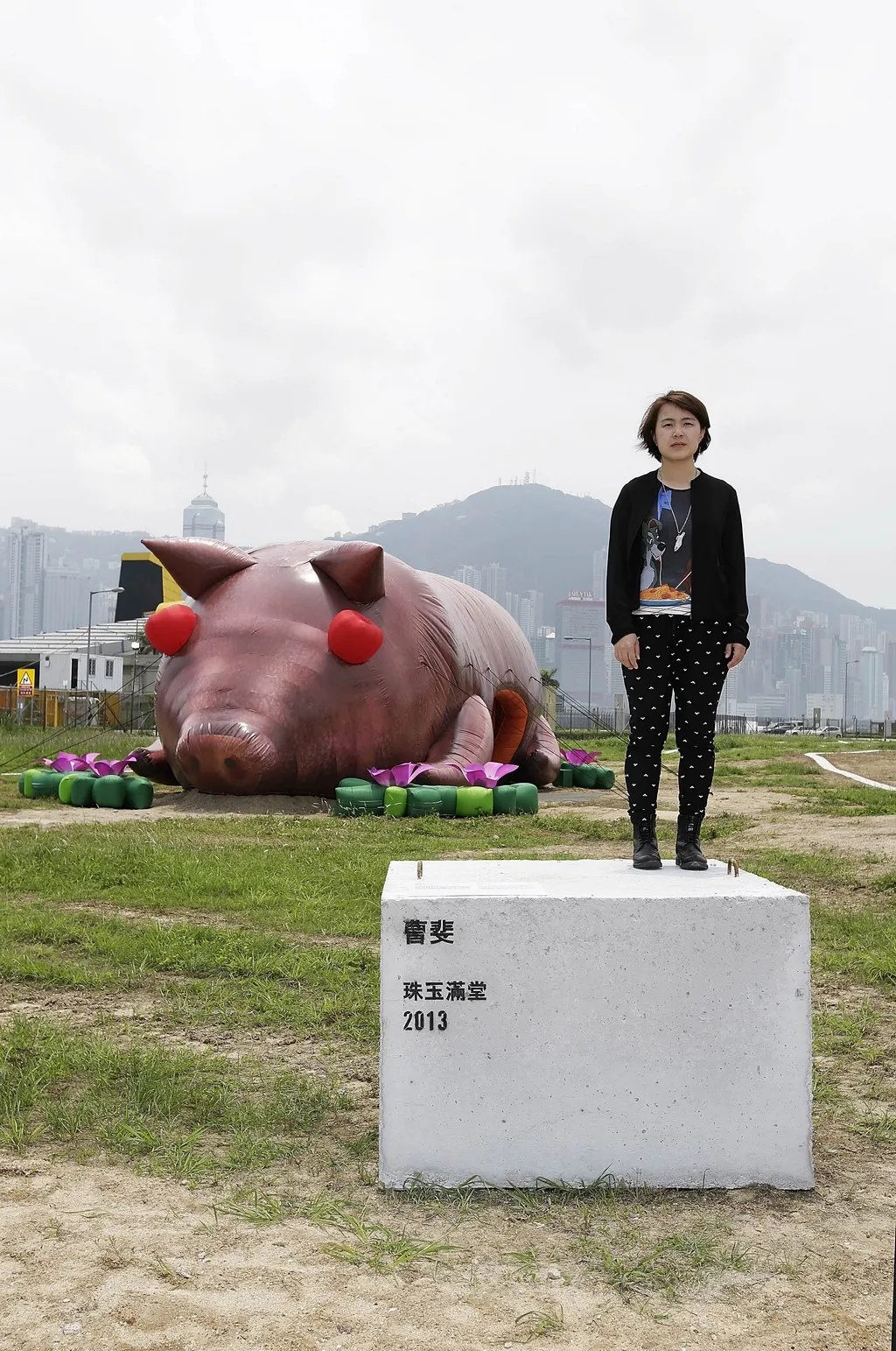 HONG KONG- APRIL 24: Chinese contemporary artist Cao Fei poses with her inflatable sculpture of a pig, named 'House of Treasures' during the 'Inflation!' exhibition curated by Mobile M + on April 24, 2013 in Hong Kong. The inflatable artwork is one of six on display as part of the exhibition which is open from April 25, 2013 until June 9, 2013. (Photo by Jessica Hromas/Getty Images)