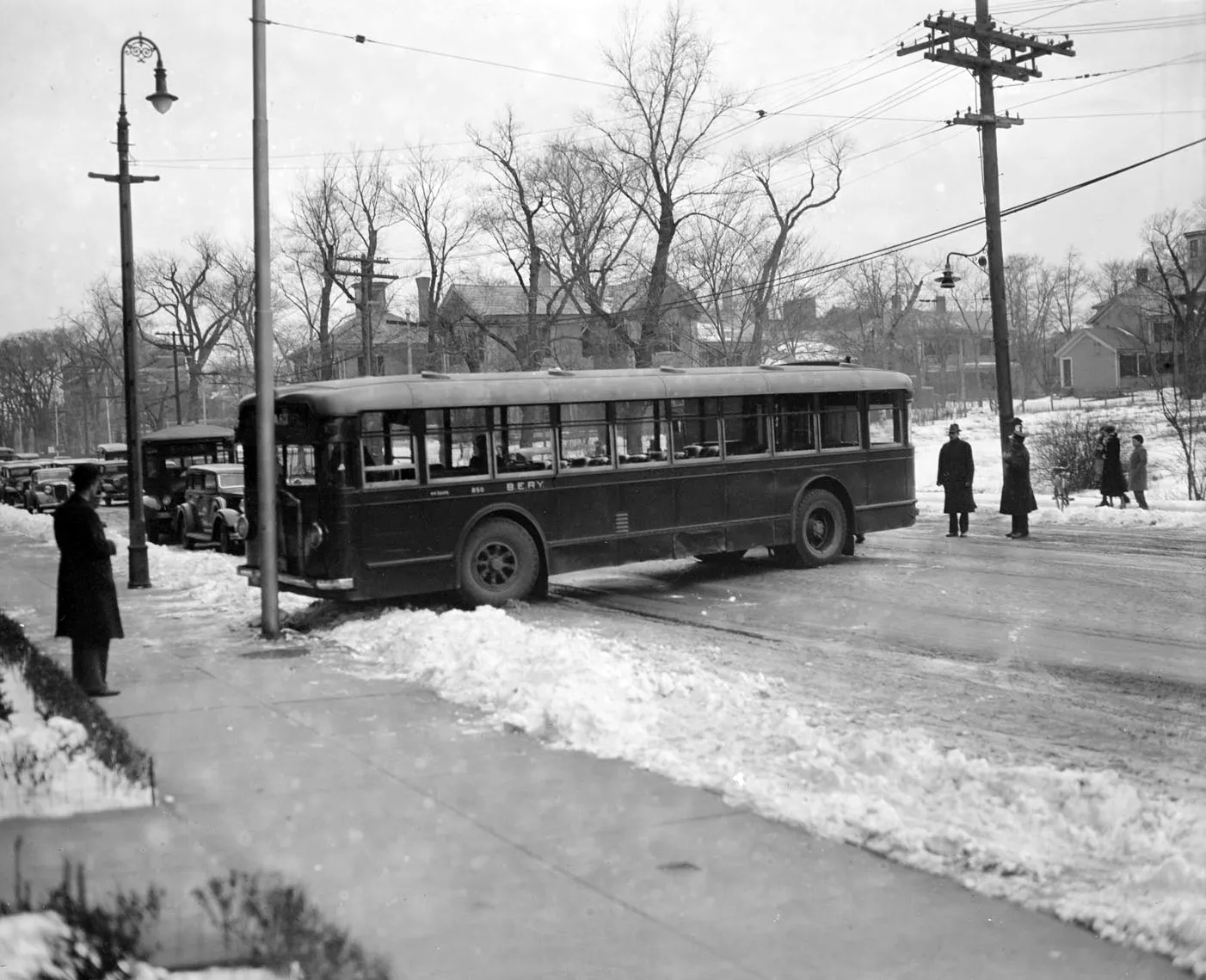 Bus goes sideways on icy road, circa 1930. (Photo by Leslie Jones)