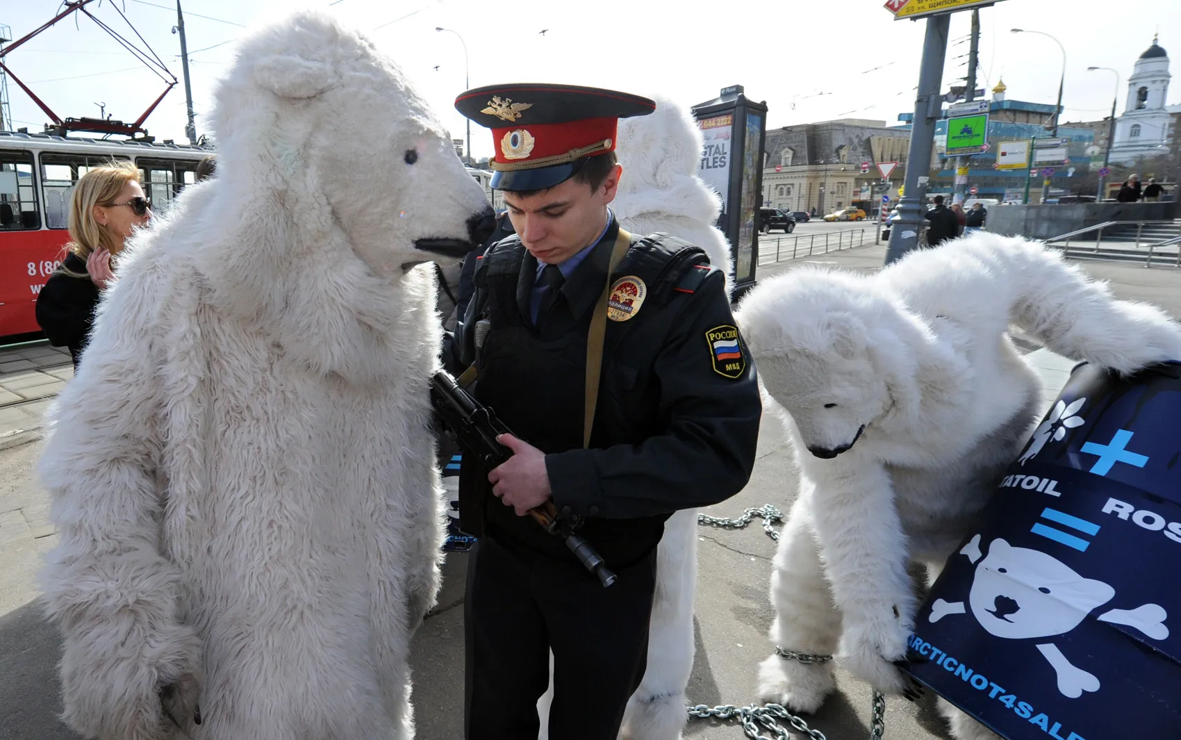 Police officers detain Greenpeace activists wearing polar bears costumes outside Norwegian oil and gas group Statoil's office in Moscow, on April 25, 2013, after their staged show against Statoil's planned drilling in the Arctic. According to Greenpeace the staged show was aimed to draw attention to the threats of the catastrophic climate and environment consequences of Arctic oil drilling. (Photo by Yuri Kadobnov/AFP Photo)