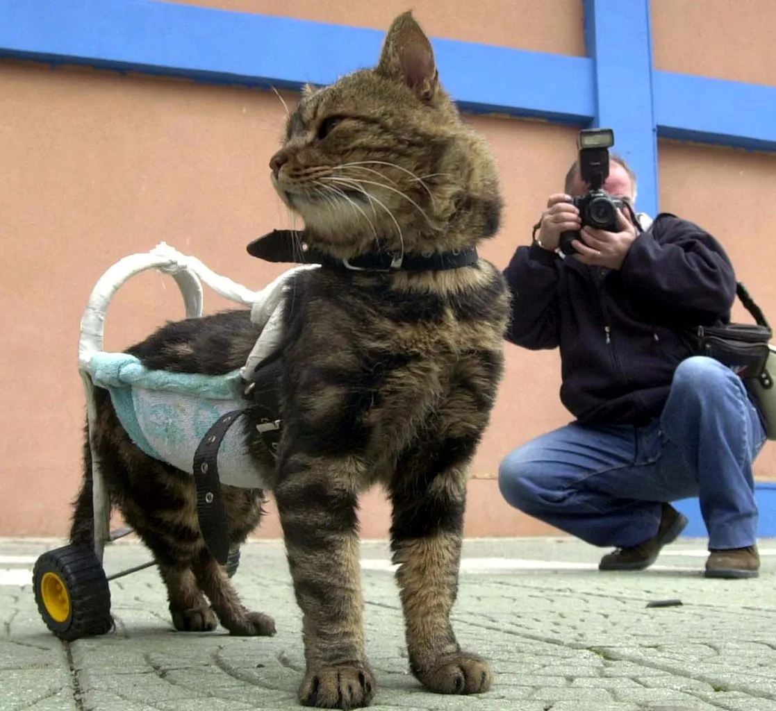 A seven-year-old disabled cat named Cici is helped to walk by a device as she participates in “Cat Show 2002” in the western Turkish city of Izmir, December 29, 2002. Cici was disabled in a traffic accident two months prior. (Photo by Reuters)