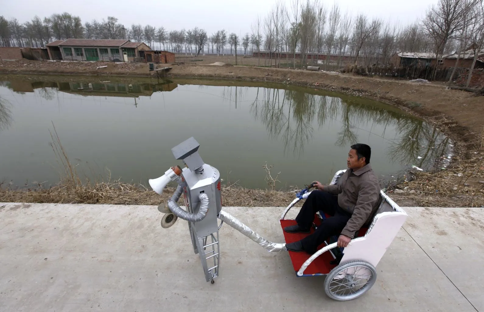 Farmer Wu Yulu, 48, rides in a cart pulled by his walking robot near his home in a village at the outskirts of Beijing April 14, 2010. Hobby inventor Wu, who started to build robots in 1986, has invented 47 robots with different functions like jump, paint, drink, pull cart, massage, and help cooking. He will display more than 30 his robots during Shanghai World Expo 2010, and he wants to promote his practical robots into market by the Expo. (Photo by Petar Kujundzic/Reuters)