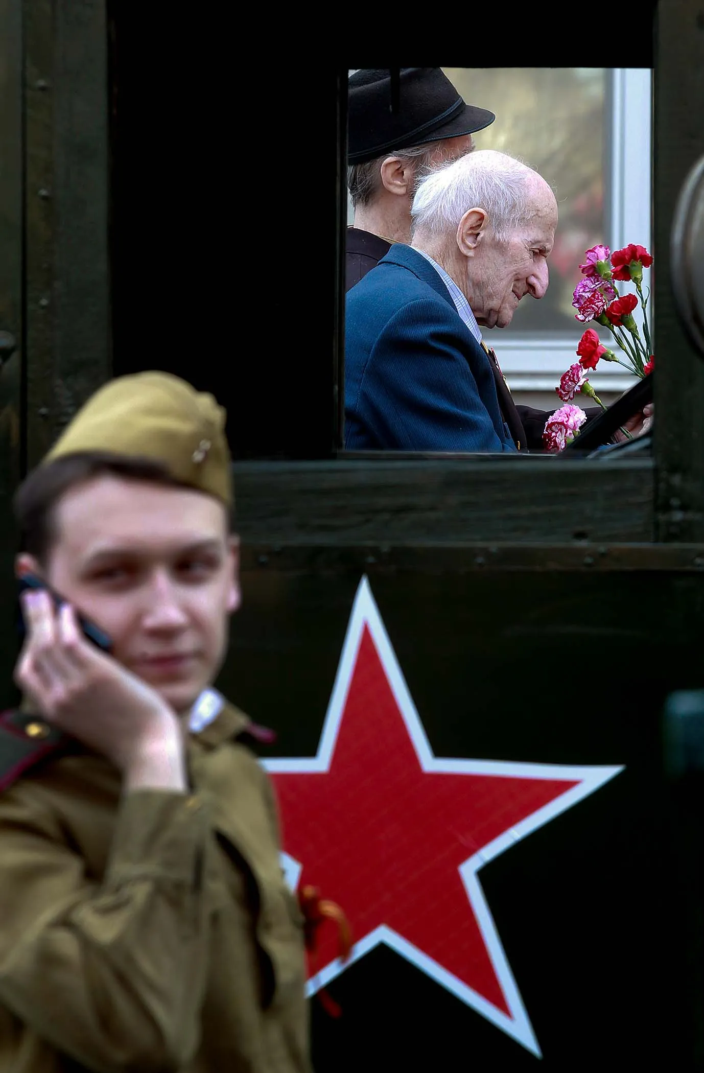World War II veterans ride a car as a member of a historical military club wearing Soviet army uniform speaks on a phone during the celebration of Victory Day in St. Petersburg, Russia. (Photo by Dmitry Lovetsky/Associated Press)