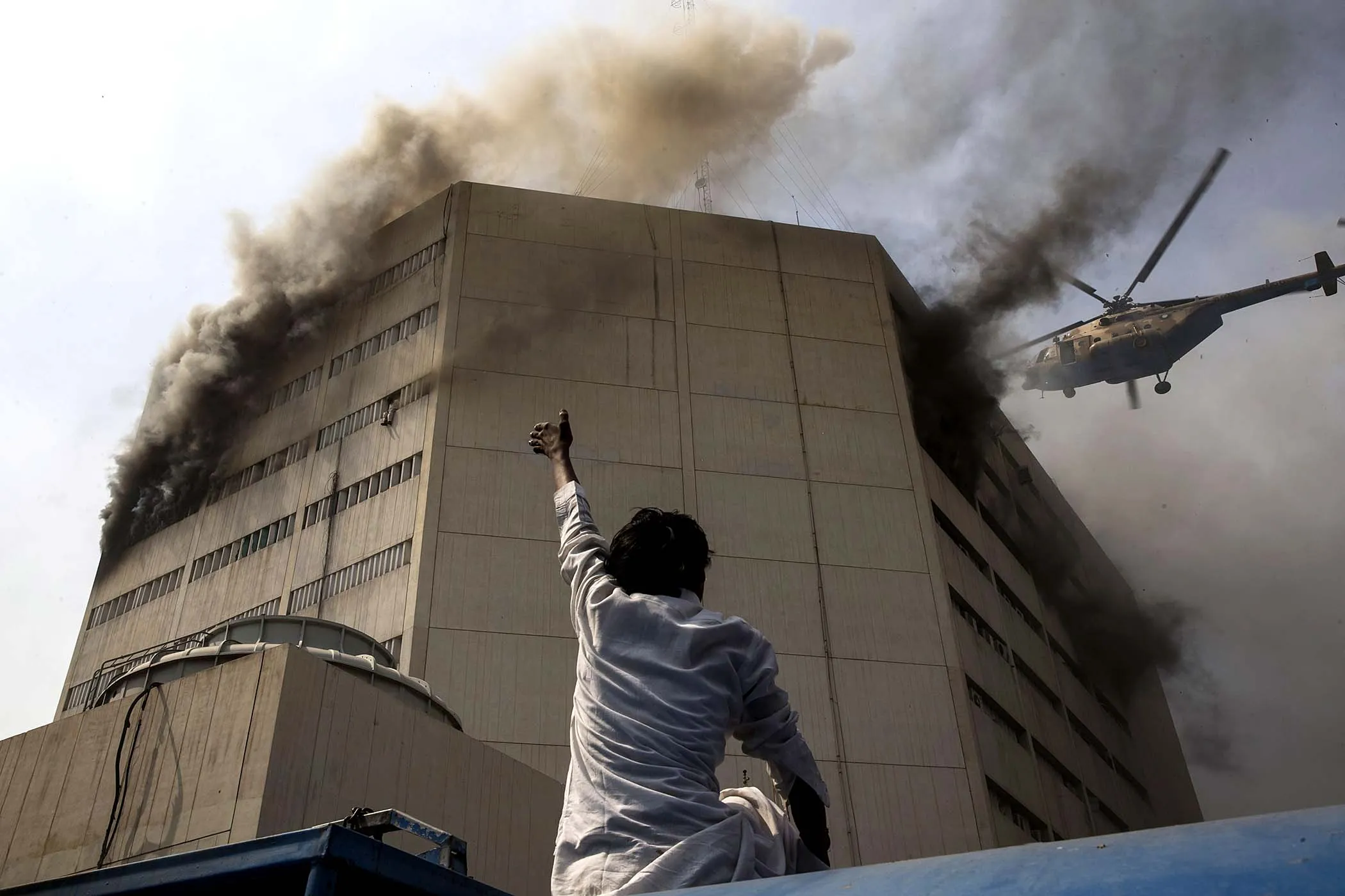 A bystander gestures to a helicopter and points to a man stranded by a fire at the Lahore Development Authority Plaza in Lahore, Pakistan. Helicopters were used to rescue stranded victims from the roof of the building, but at least five people plunged to their deaths from the burning building. (Photo by Daniel Berehulak/Getty Images)
