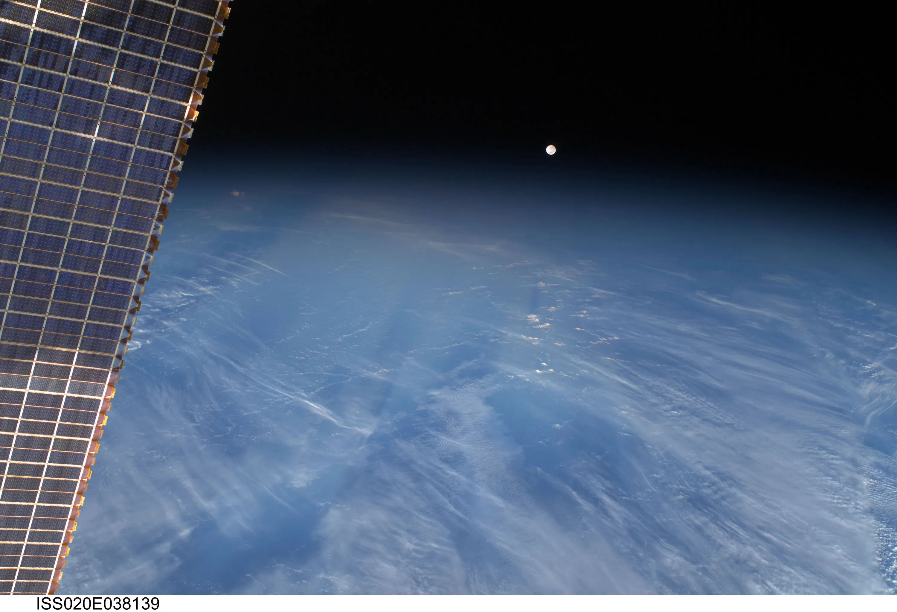 A full moon is visible with part of the International Space Station's solar array wing in this view above Earth's horizon, photographed by a crew member from the International Space Station while Space Shuttle Discovery (STS-128) remains docked with the station in this NASA handout photo taken September 3, 2009. (Photo by Reuters/NASA)