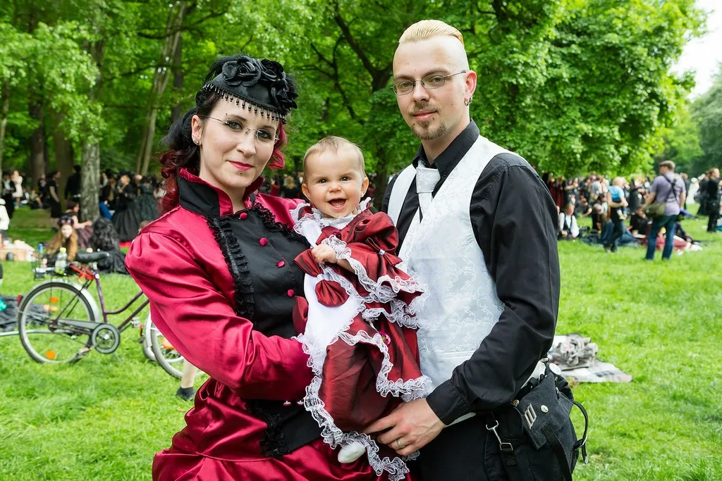 LEIPZIG, SAXONY - MAY 17: A young family dressed in Victrorian costumes pose for pictures during the traditional park picnic on the first day of the annual Wave-Gotik Treffen, or Wave and Goth Festival, on May 17, 2013 in Leipzig, Germany. The four-day festival, in which elaborate fashion is a must, brings together over 20,000 Wave, Goth and steam punk enthusiasts from all over the world for concerts, readings, films, a Middle Ages market and workshops. (Photo by Marco Prosch/Getty Images)