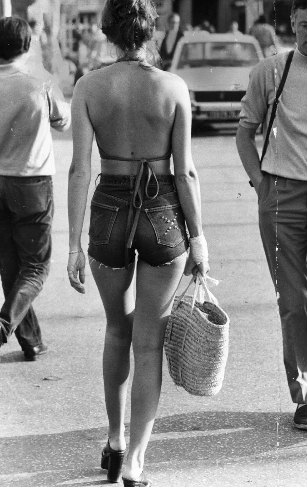A woman wearing cut-off jeans and a halter-neck sun top in St Tropez, 1972. (Photo by Roy Jones/Getty Images)