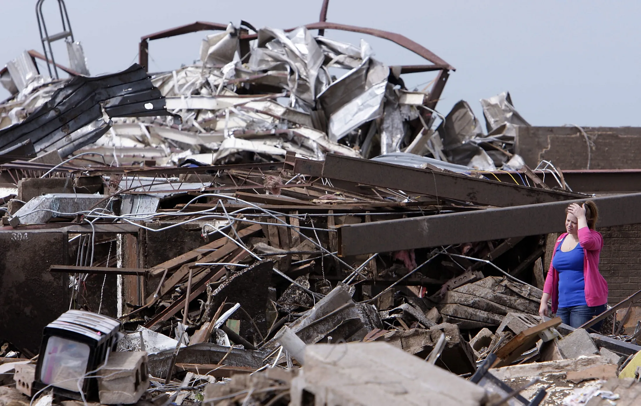 Amber Ford, a teaching assistant, goes through the rubble of a second grade classroom she works in at the Briarwood Elementary School in Oklahoma City, Okla. Tuesday, May 21, 2013. A huge tornado roared through the Oklahoma City area Monday, flattening entire neighborhoods and destroying the elementary school with a direct blow as children and teachers huddled against winds. (Photo by Michael Wyke/AP Photo/Tulsa World)