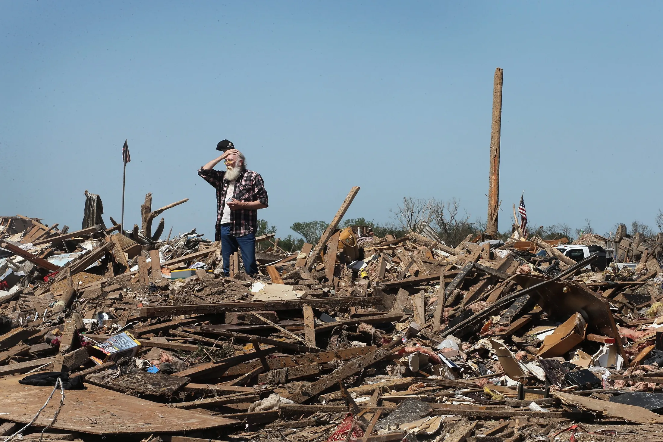John Wilson surveys the neighborhood from atop the rubble that was once a home that his son and ex-wife shared before the home and the neighborhood were destroyed by a tornado that ripped through the area on May 22, 2013 in Moore, Oklahoma. The tornado of at least EF4 strength and two miles wide touched down May 20 killing at least 24 people and leaving behind extensive damage to homes and businesses. U.S. President Barack Obama promised federal aid to supplement state and local recovery efforts. (Photo by Scott Olson/AFP Photo)