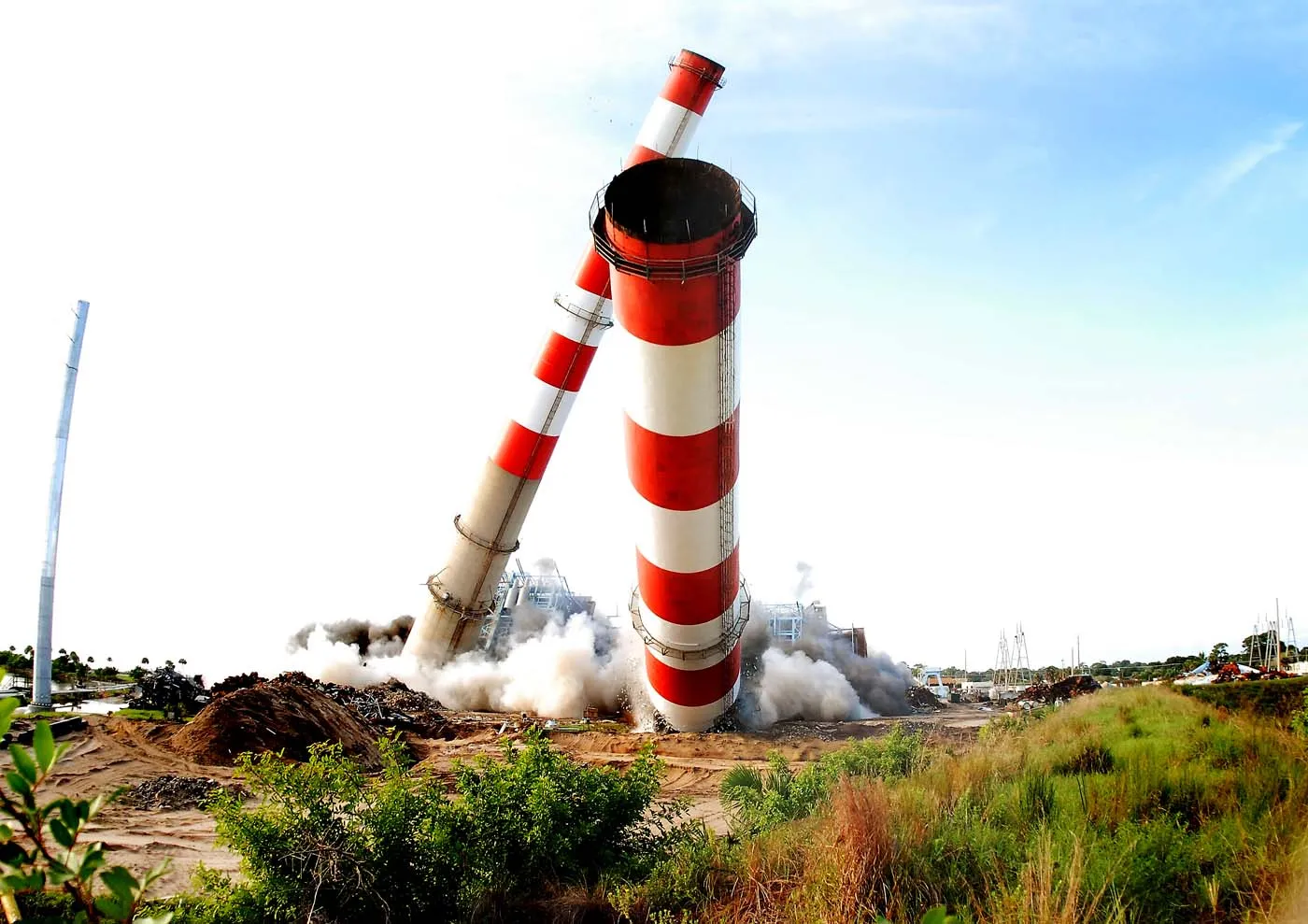 The 400 foot tall stacks and boilers at FPL's Cape Canaveral power plant go down in Cocoa to make way for a new clean energy center that will open at the site in 2013. (Photo by Doug Murray/Associated Press/Florida Power & Light Company)