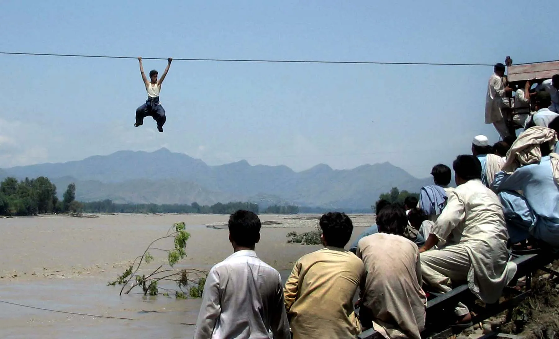 Onlookers perched on a damaged bridge watch a flood survivor climb a rope to cross the river in Pakistan's Swat Valley's Chakdara on August 3, 2010. (Photo by AFP Photo)