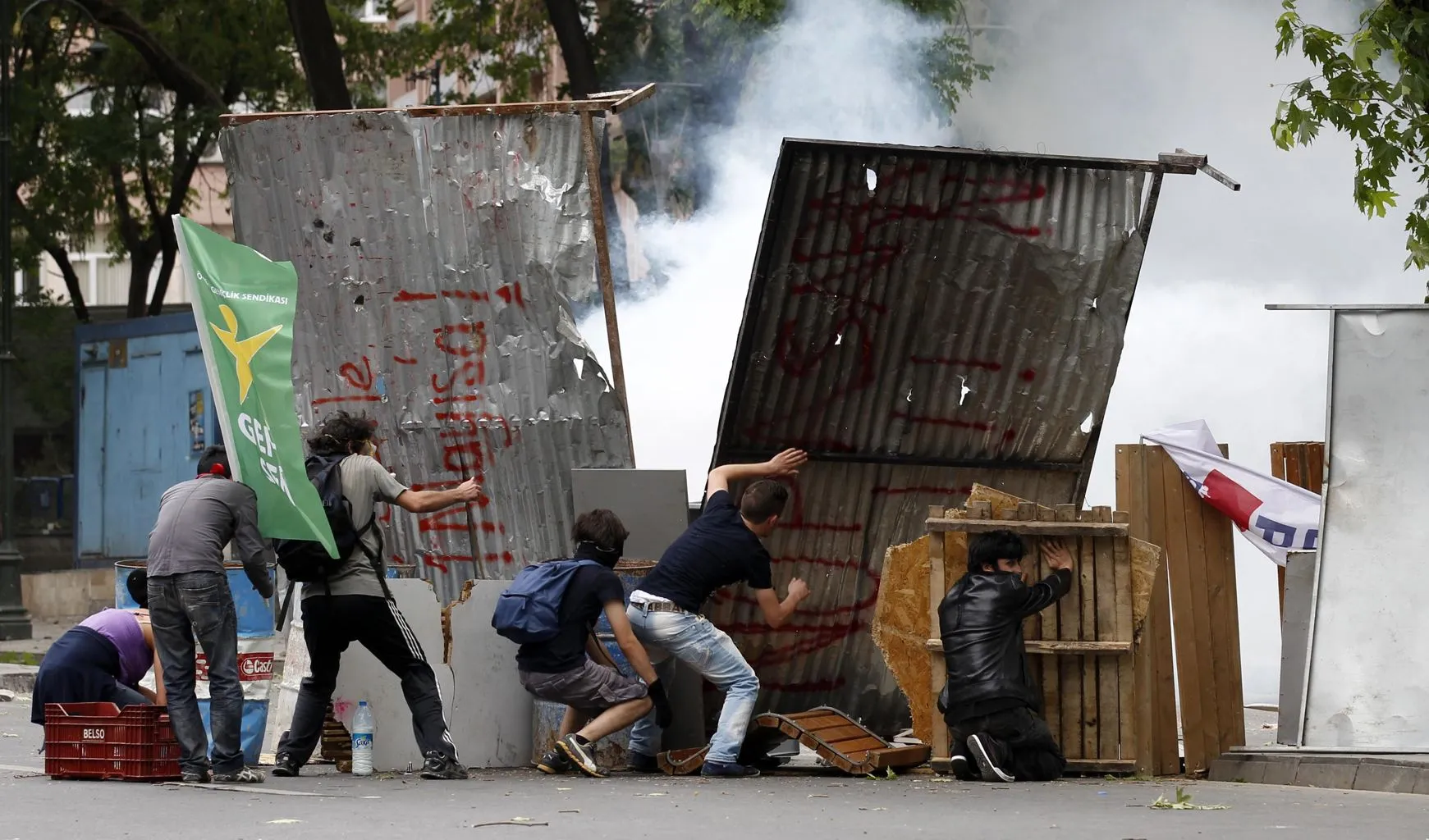 Demonstrators stand in front of a make shift shield during clashes with Turkish riot police in central Ankara June 2, 2013. Erdogan accused Turkey's main secular opposition party on Sunday of stirring a wave of anti-government protests, as tens of thousands regrouped in Istanbul and Ankara after a lull and trouble flared again in the capital. Police used tear gas on protesters in Ankara but the clashes were relatively minor compared with major violence in Turkey's biggest cities on the previous two days. (Photo by Umit Bektas/Reuters)