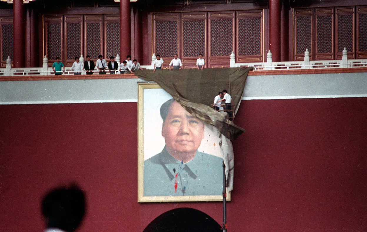 Workmen try to drape the portrait of Mao Tse-tung in Beijing's Tiananmen Square after it was pelted with paint, on May 23, 1989. (Photo by Ed Nachtrieb/Reuters)