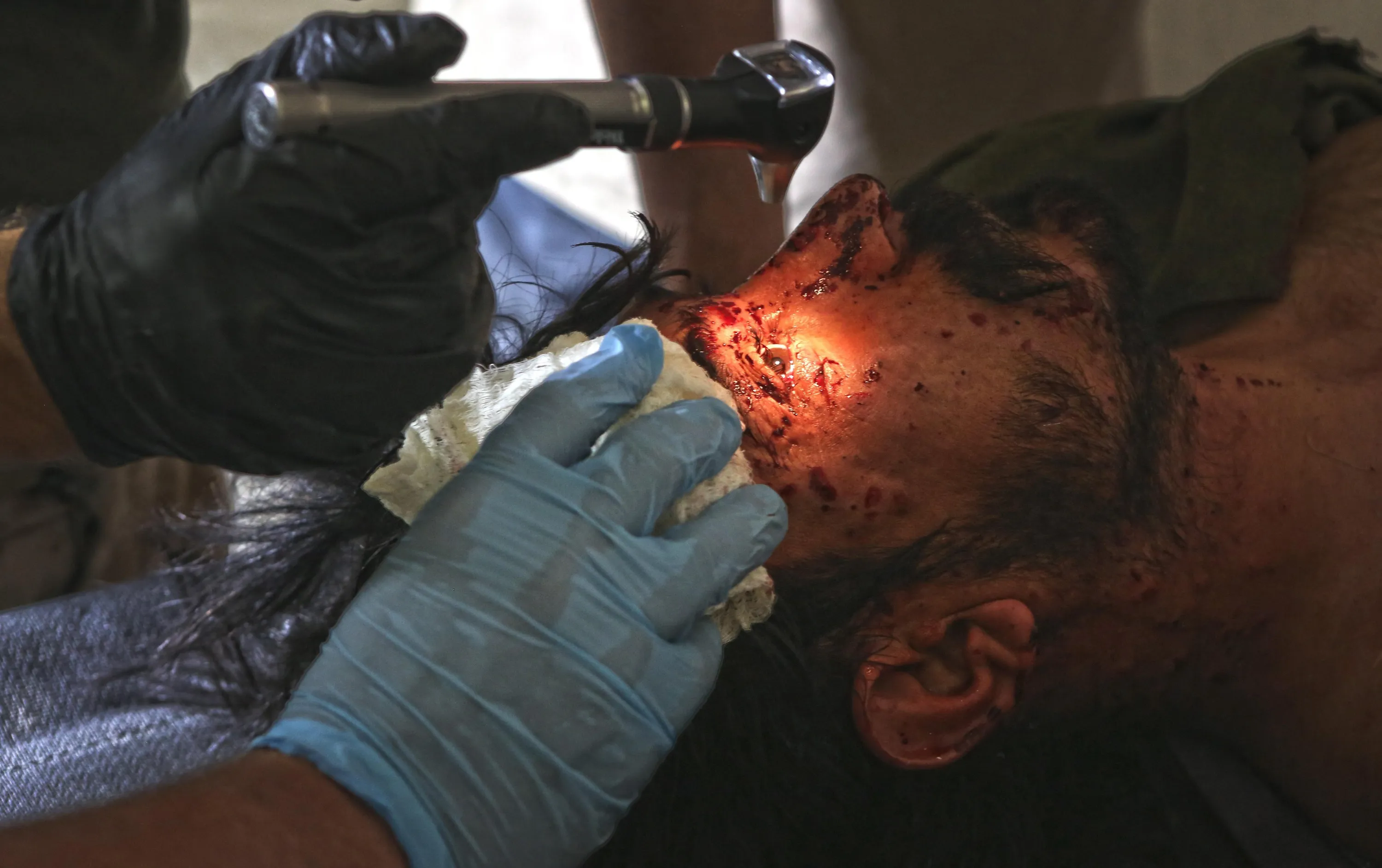 Corpsmen with Combat Logistics Regiment 2, II Marine Logistics Group provide medical care to an Afghan Uniformed Police officer at Combat Outpost Musa Qa'la, on May 18, 2013. The AUP were patrolling through Musa Qa'la District when a roadside IED detonated. The police officer sustained minor injuries to his head and face, caused by shrapnel from the explosion. (Photo by Sgt. Bobby J. Yarbrough/USMC)