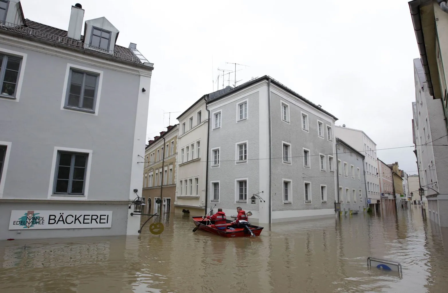 Members of the emergency services travel by boat along flooded streets in the centre of the Bavarian town of Passau, about 200 km (124 miles) north-east of Munich June 3, 2013. Torrential rain in the south and south-east of Germany caused heavy flooding over the weekend, forcing people to evacuate their homes. (Photo by Michaela Rehle/Reuters)