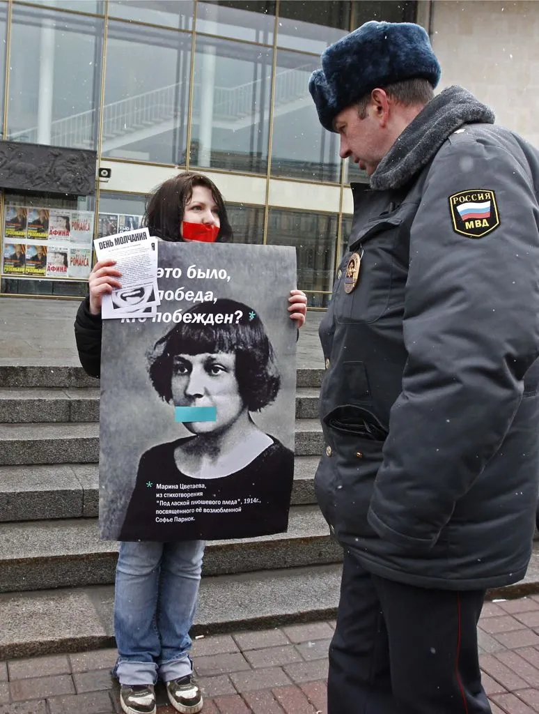 A gay rights activist holds a board displaying 19th century Russian poet Marina Tsvetaeva during an unsanctioned protest rally to defend the rights of Russian gays and lesbians in St. Petersburg, in this April 7, 2012 file photo. Along with a planned new law banning the spread of gay “propaganda” among minors, President Vladimir Putin has also overseen a religious revival that aims to give the Orthodox Church, whose leader has suggested that homosexuality is one of the main threats to Russia, a more public role as a moral authority. The number of documented cases of violence against gays in Russia is low. But there are no official figures on anti-gay crime in Russia, and gay rights campaigners say the numbers available mask the true number of attacks on gays, lesbians, bisexual and transgender people. Most go unreported, or are not classified as such by the police. (Photo by Alexander Demianchuk/Reuters)