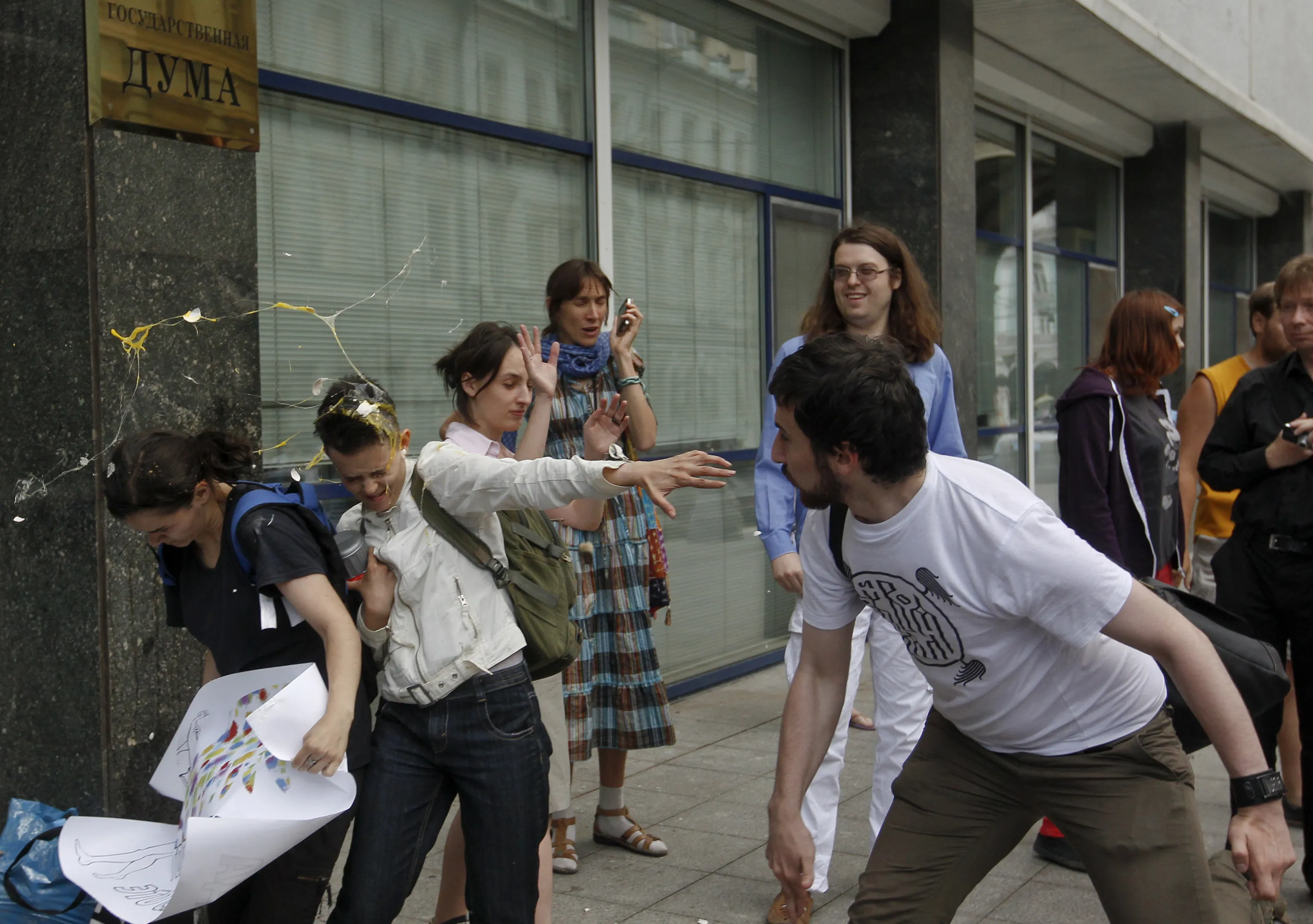 A radical Orthodox believer (R) throws an egg at gay rights activists during a protest against a proposed new law termed by the State Duma as “against advocating the rejection of traditional family values” in central Moscow June 11, 2013. Russian police detained more than 20 gay rights activists involved in a “kissing protest” on Tuesday outside parliament where lawmakers were preparing to pass a bill banning homosexual “propaganda”. (Photo by Maxim Shemetov/Reuters)