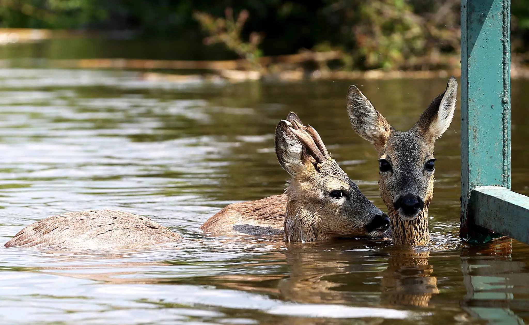 Two deer stand on a bridge in floodwaters of the Elbe river in Schoenhausen, Germany, on June 12, 2013. Disastrous floods in Germany began to subside Wednesday after leaving at least 19 people dead in central Europe, as Chancellor Angela Merkel prepared to make her fourth visit to the stricken region. (Photo by Christian Charisius/Getty Images)