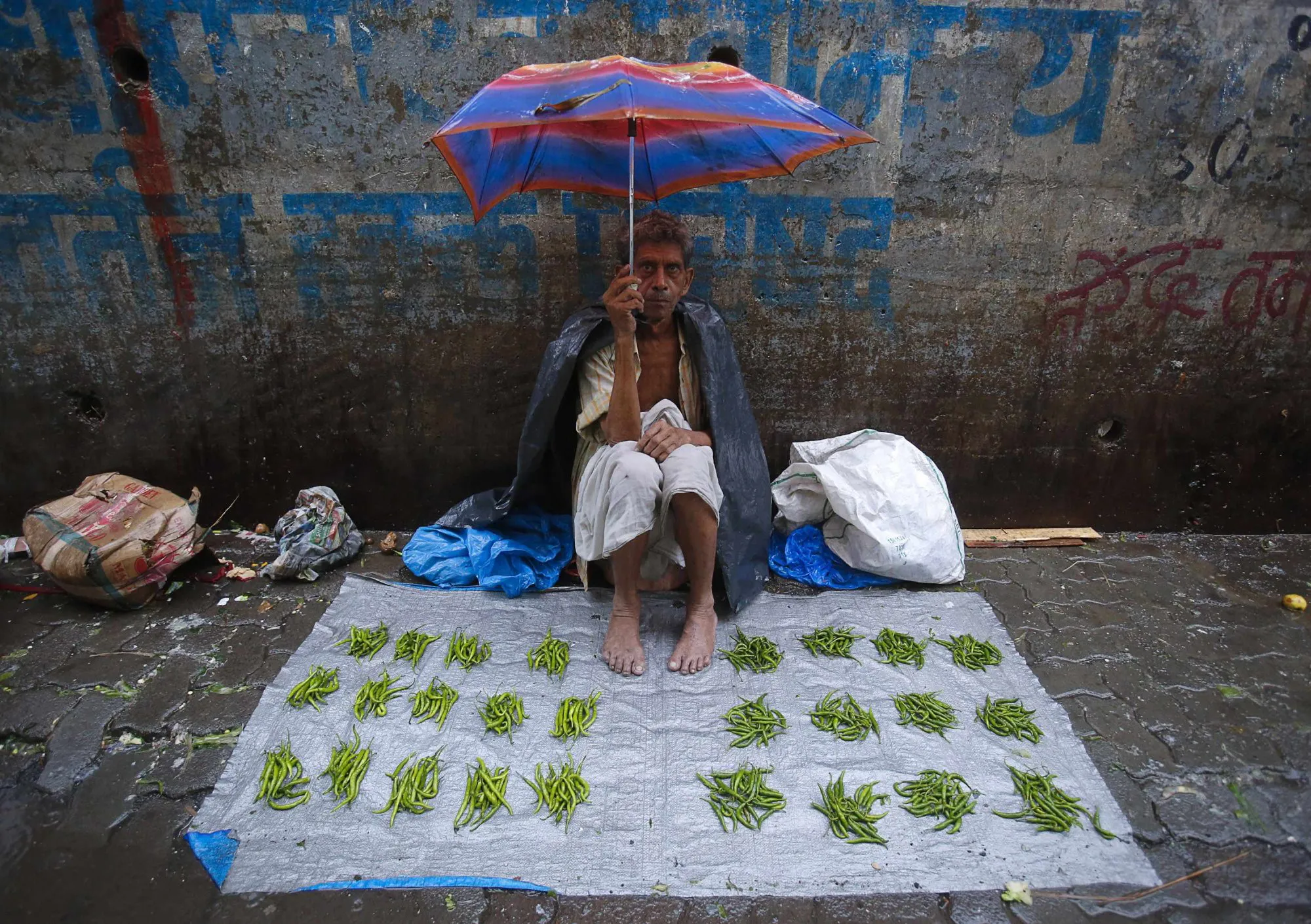 A vegetable vendor sits under an umbrella on a tarpaulin sheet at a market during monsoon rains in Mumbai June 18, 2013. The rains are at least twice as heavy as usual in northwest and central India as the June-September monsoon spreads north, covering the whole country a month faster than normal. (Photo by Vivek Prakash/Reuters)