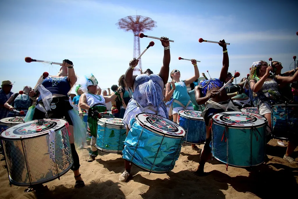 NEW YORK, NY - JUNE 22: Musicians perform on the beach at the 2013 Mermaid Parade at Coney Island on June 22, 2013 in the Brooklyn borough of New York City. Coney Island was hard hit by Superstorm Sandy but parade organizers, whose offices were flooded, were able to raise $100,000 on Kickstarter to fund the parade. The Mermaid Parade began in 1983 and features participants dressed as mermaids and other sea creatures while paying homage to the former tradition of the Coney Island Mardi Gras which ran annually in the early fall from 1903-1954. (Photo by Mario Tama/Getty Images)