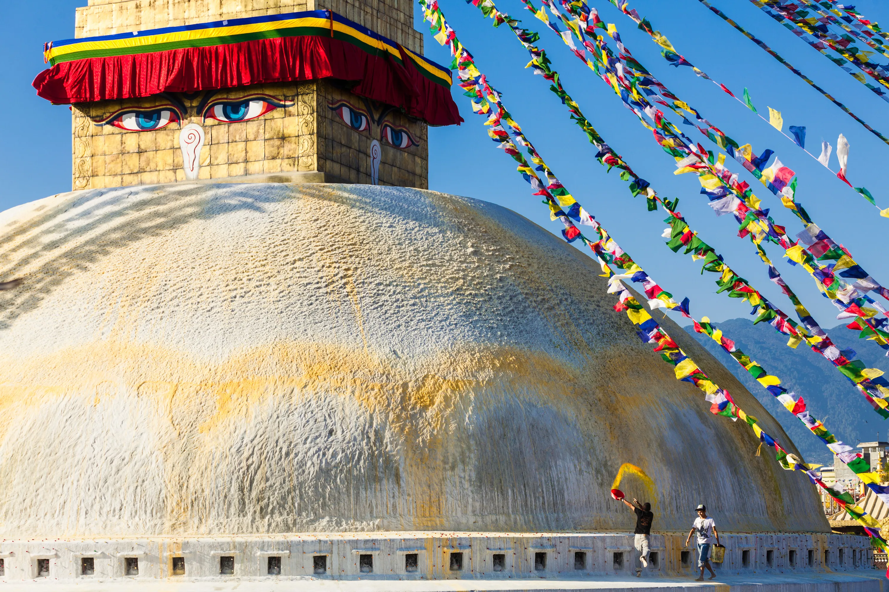 “Cleaning The Stupa”. Custodians fling yellow colored water made from saffron onto Bodhnath Stupa in Nepal. The yellow arc represents the double lotus. Bodhnath Stupa, located in the Kathmandu Valley, lies on the ancient trade route from Tibet and attracts thousands of pilgrims and tourists daily. (Photo and caption by Craig Ferguson/National Geographic Traveler Photo Contest)