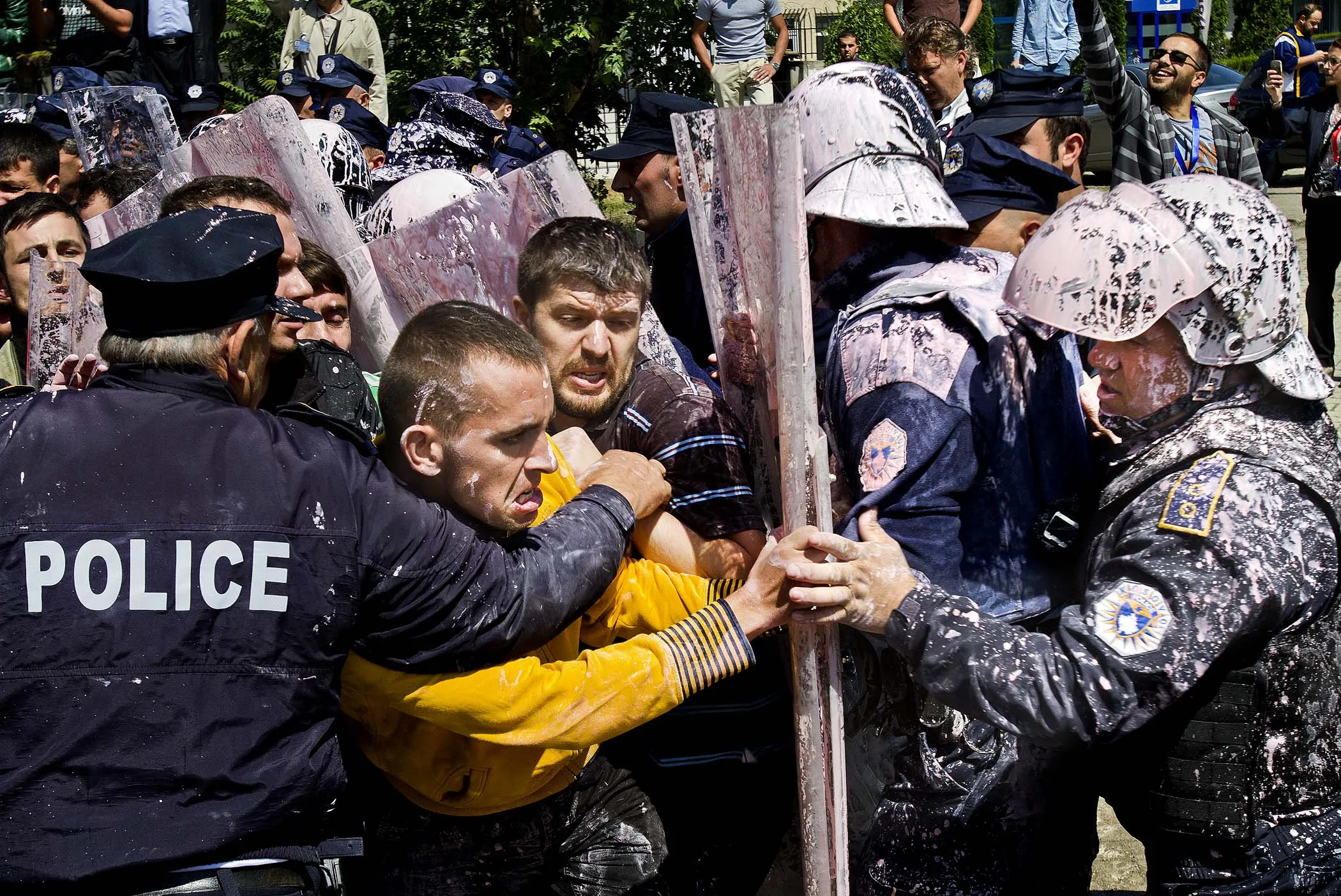Police, who were splashed with paint, scuffle with hard line opposition members in Pristina, Kosovo, protesting an agreement by lawmakers to normalize relations with Serbia, on June 27, 2013. (Photo by Visar Kryeziu/Associated Press)
